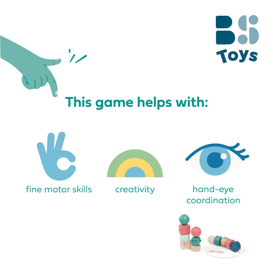 Oplev en sjov motorisk leg, der naturligt fører børn til at træne fingerfærdighed og tålmodighed. De store træperler i forskellige former og farver er lette at gribe og trække på en snor med træender. Aktiviteten stimulerer udvikling af finmotorik, hånd-øje-koordination og farvegenkendelse.