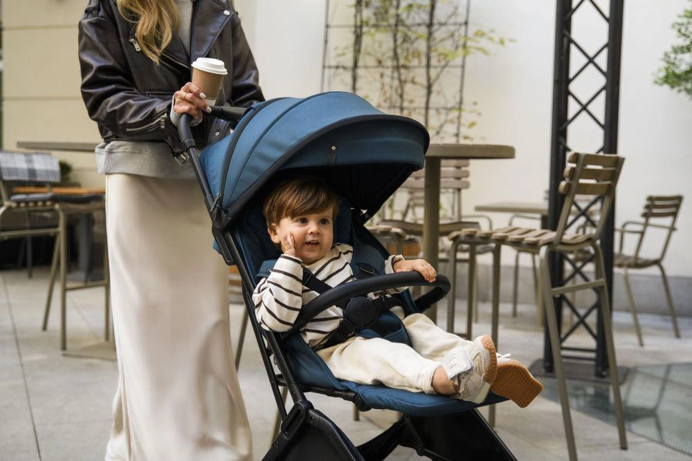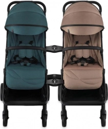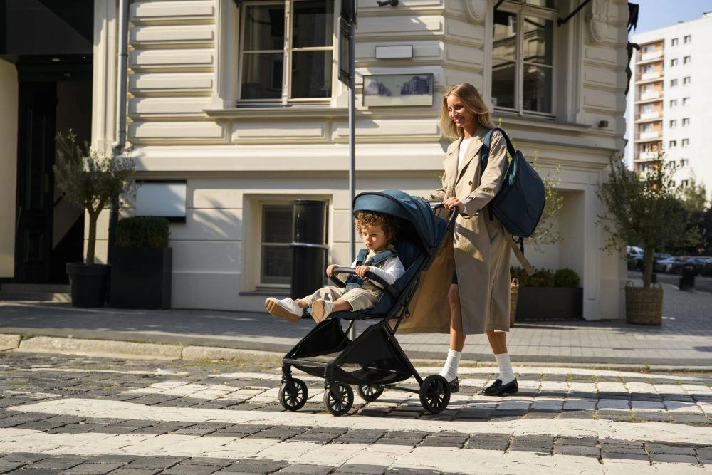 EVA-hjul 6,5"/7" klarer både by og park ubesværet. Inkluderet: rygsæk, kopholder, myggenet og regnslag; valgfrit kan to klapvogne kobles sammen.