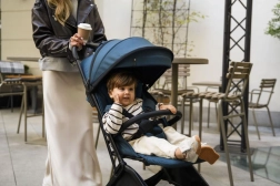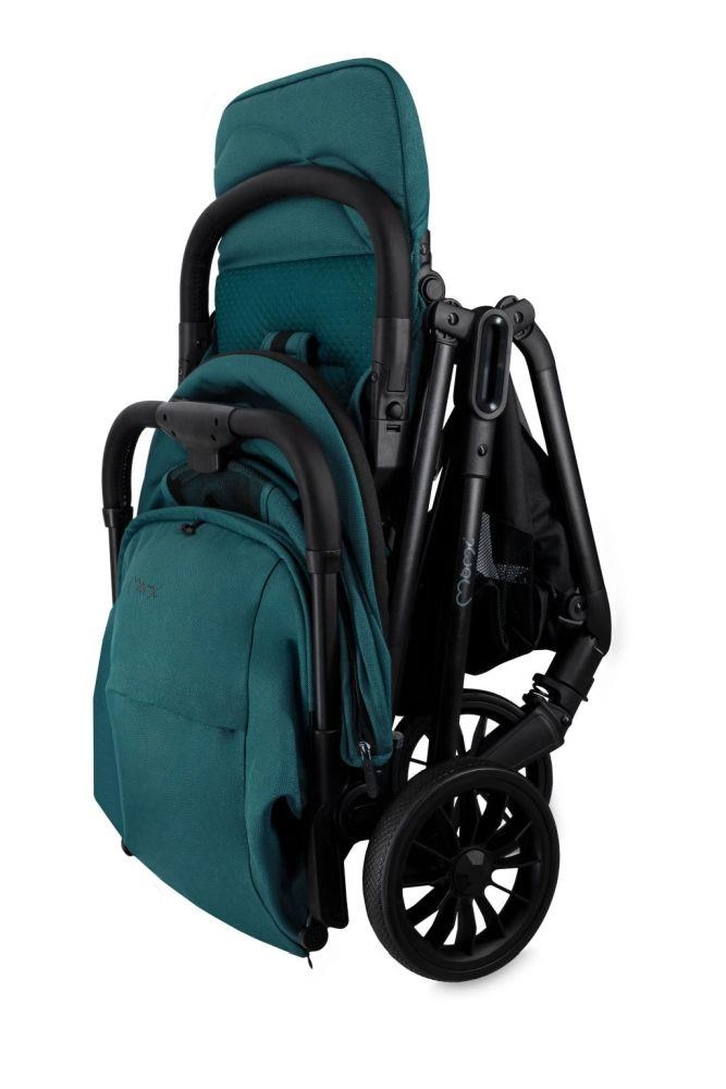 Det selvfoldende system sparer tid og plads – klapvognen folder sig selv sammen ved et tryk på en knap og står stabilt i sammenfoldet tilstand.