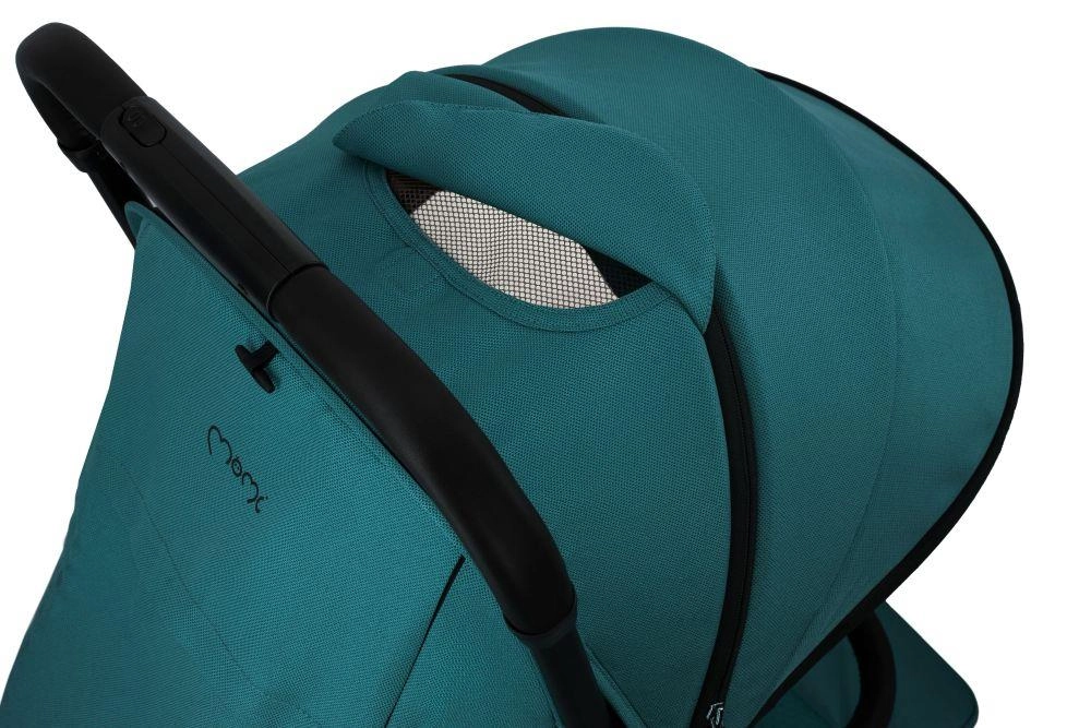 Justerbart ryglæn og 4-trins fodstøtte, kaleche med kontrolvindue og bageste netventilation for barnets komfort.