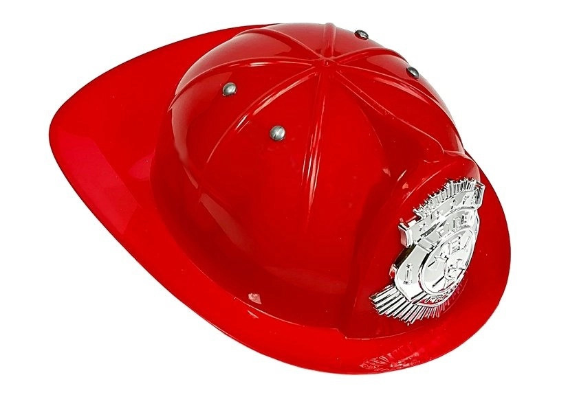 Rød børnehjelm med ventilationsnitter og emblem giver behagelig pasform og fuldender brandmandskostumet.