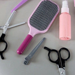 Børste, kam, sakse uden skær, effileringssaks, curlere, clips og tom flaske – komplet udstyr til hverdagens frisørhistorier.