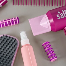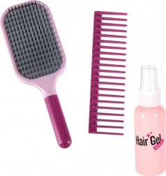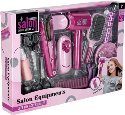 I pakken finder du alt til en komplet make-over: hårtørrer med to mundstykker (koncentrator og diffuser), børneglattejern med stander, børste og kam, 2 typer sakse uden skarpe kanter, curlere og clips samt en tom flaske til “styling”. Hele sættet er let, robust og sikkert for børn fra 3 år.