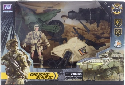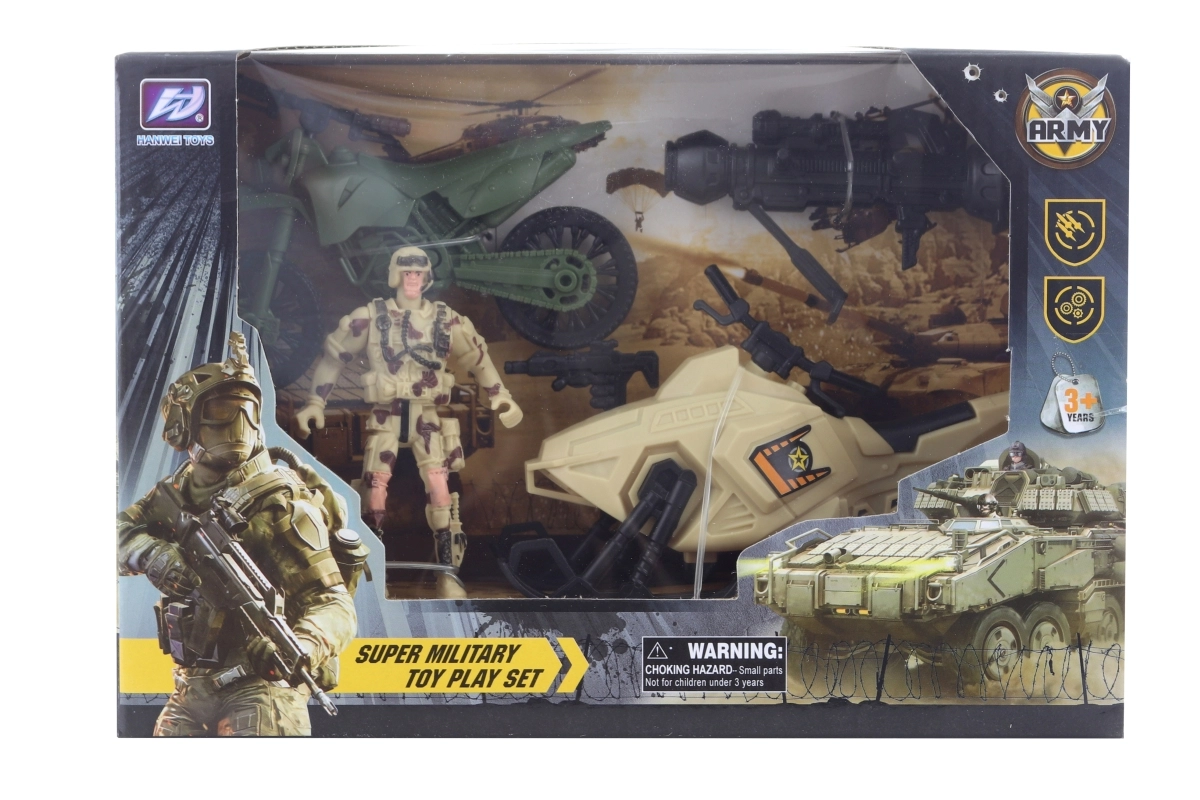 Dette militære plastiksæt med scooter giver børn masser af actionfyldt underholdning. Takket være det robuste materiale er det ideelt til daglig leg og understøtter udviklingen af fantasi og motoriske færdigheder. Den praktiske æske gør det til en fantastisk gave.