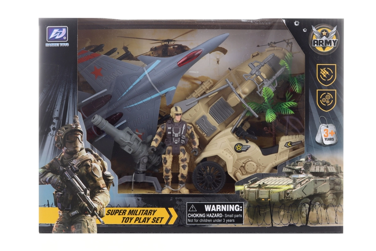 Sættet indeholder en soldaterfigur, jagerfly, motorcykel og vandscooter, suppleret med mindre tilbehør for endnu mere realistisk leg. Den kompakte emballage egner sig også perfekt som gave.