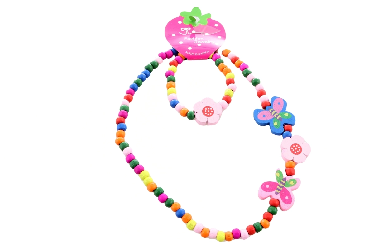 Dette elegante sæt med sommerfuglemotiv vil glæde enhver lille elsker af accessories. Takket være den elastiske snor er både halskæde og armbånd lette at tage på og sidder godt, mens træperler giver et naturligt look og lethed.