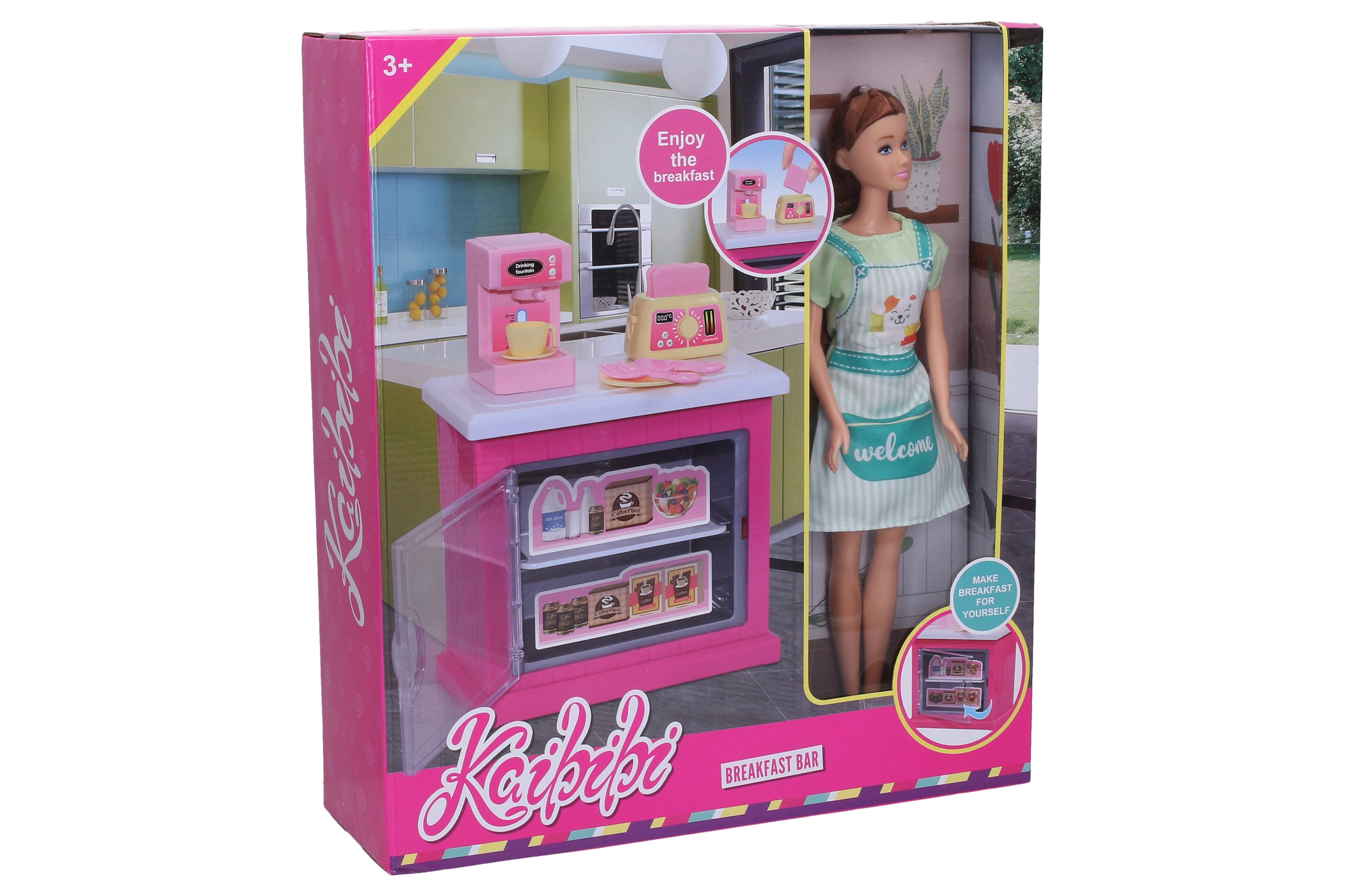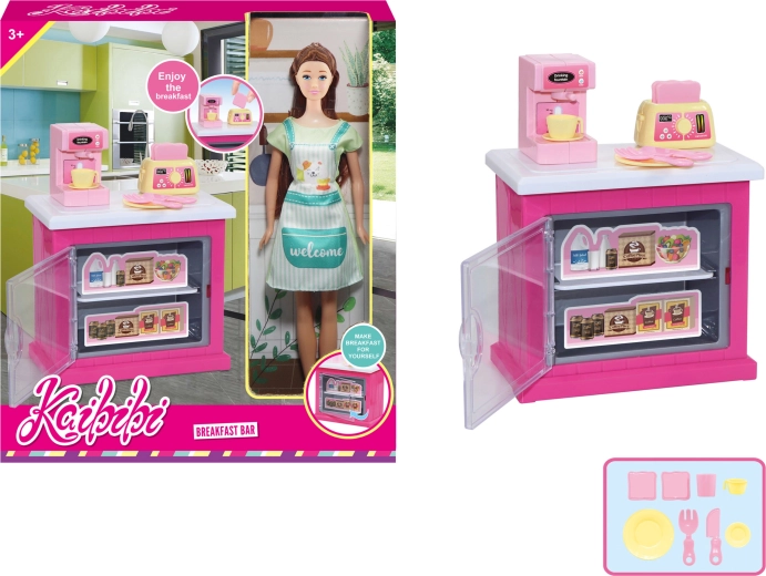 Pakken indeholder et stilfuldt køkkenskab, funktionsdygtigt tilbehør som kaffemaskine og brødrister samt andet køkkentilbehør, så børnene nemt kan “brygge kaffe” og lave sprøde toast til deres gæster.