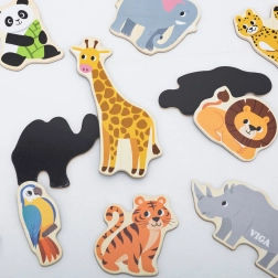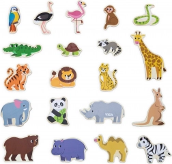 • 20 træmagneter med motiver: giraf, næsehorn, elefant, kænguru, løve, tiger, panda, struds, flamingo, abe, zebra, kamel, krokodille, slange, skildpadde, vaskebjørn, bjørn, ara-papegøje og flere.