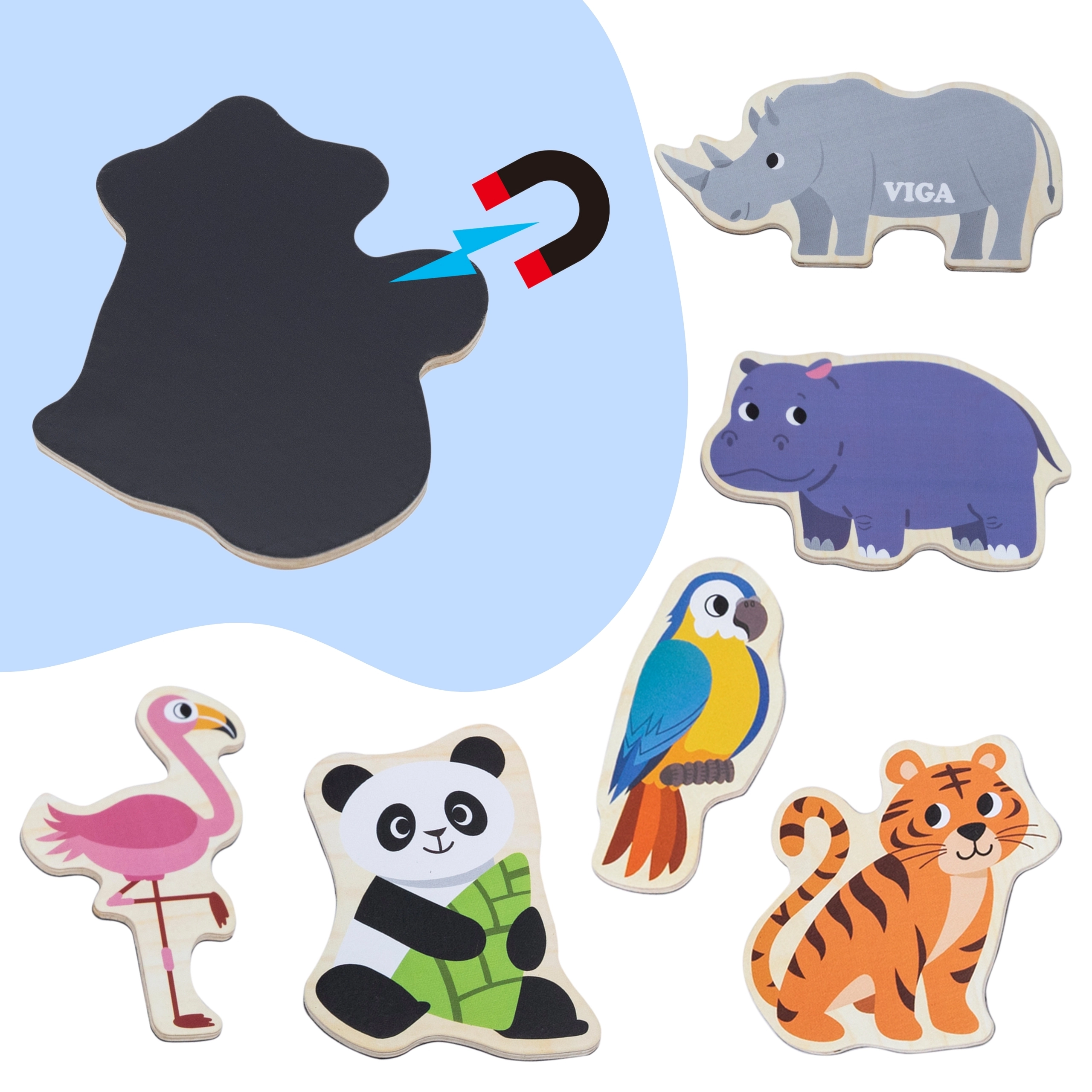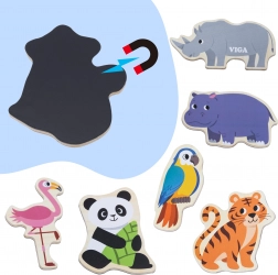 Sættet af træmagneter VIGA – Vilde dyr giver børn sjov og lærerig leg. Realistisk illustrerede figurer som løve, giraf, krokodille og papegøje stimulerer samtaler, udforskning af verden og de første historier. Takket være det stærke magnetlag sidder de fast på køleskab, magnettavle og andre metaloverflader.