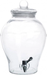 Stilfuld glasdispenser til drikke med en kapacitet på 6,5 l, udstyret med metalhane og tætsluttende låg, ideel til servering af lemonade, juice og iste. Takket være det gennemsigtige glas kan du nemt kontrollere indholdet, den brede åbning gør påfyldning og rengøring let, og silicone-pakningen i låget beskytter drikken mod insekter. Perfekt til havefester, fejringer og daglig selvbetjent forfriskning.