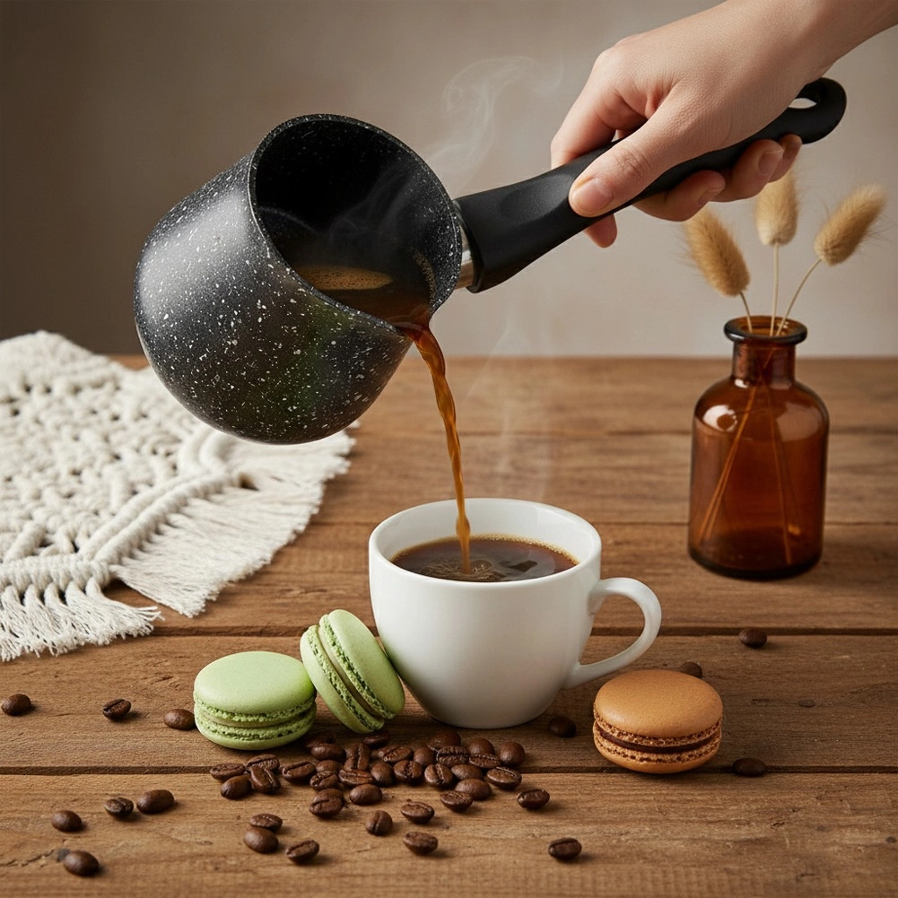 Designet til autentisk tilberedning: tilsæt malet kaffe, hæld vand på og varm langsomt op for en rig aroma uden overkogning.