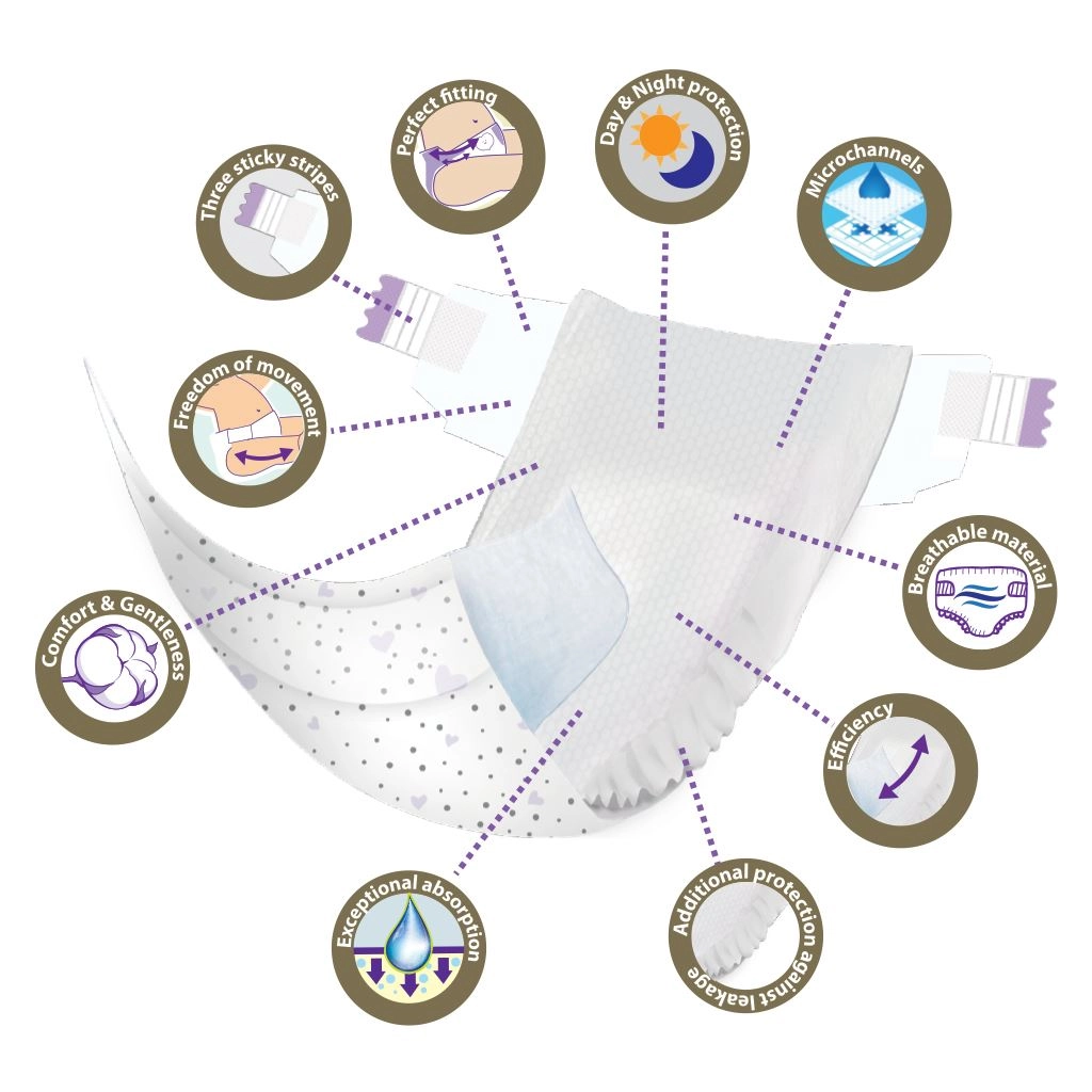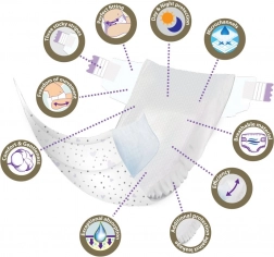 New Love Premium Comfort-bleer er designet til komfort og beskyttelse af barnets hud. Åndbare materialer fremmer luftcirkulationen, mens den innovative kerne med mikrokugler låser fugten inde med det samme og holder numsen tør. Takket være det brede, bløde frontbælte og 3D-velcrolukningen tilpasser bleen sig perfekt til maven.