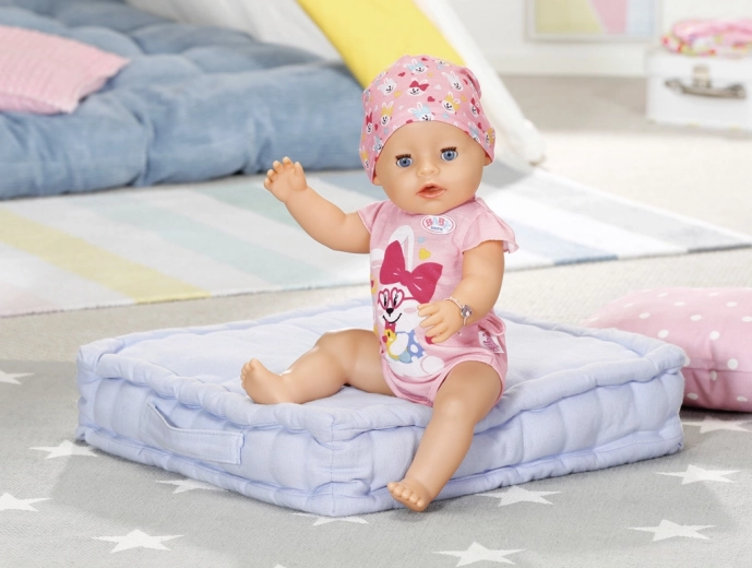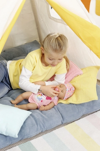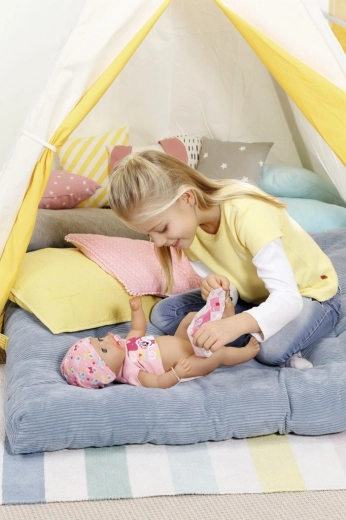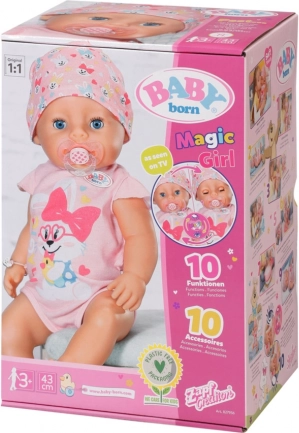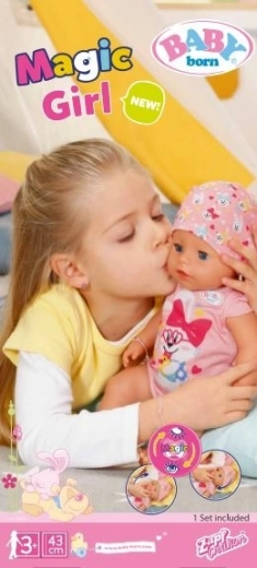 Oplev plejelegens magi med dukken BABY BORN pige 43 cm. Takket være Soft Touch-materialet er hun dejligt blød, let at klæde på, og hendes arme, ben og hoved er let bevægelige. Den magiske sut åbner og lukker øjnene med et enkelt drej – i enhver position. Uden sut lukker øjnene automatisk, når hun lægges på ryggen.