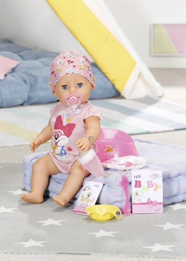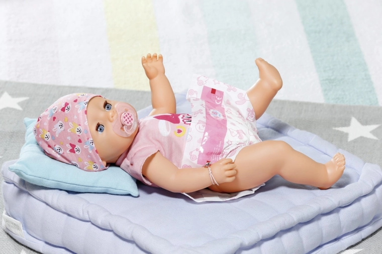 Dukken drikker vand, spiser grød, tisser i bleen og på potten, kan lave stort og fælder ægte tårer. Perfekt til træning af omsorg og daglige rutiner.
