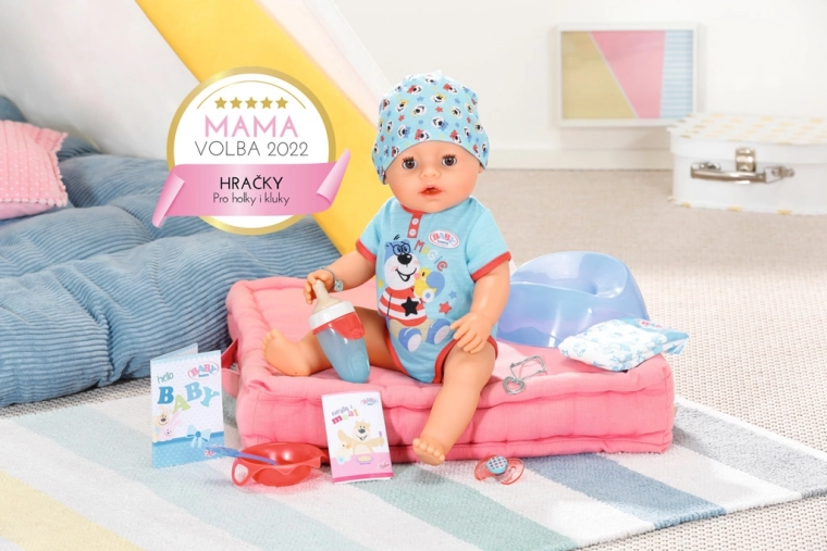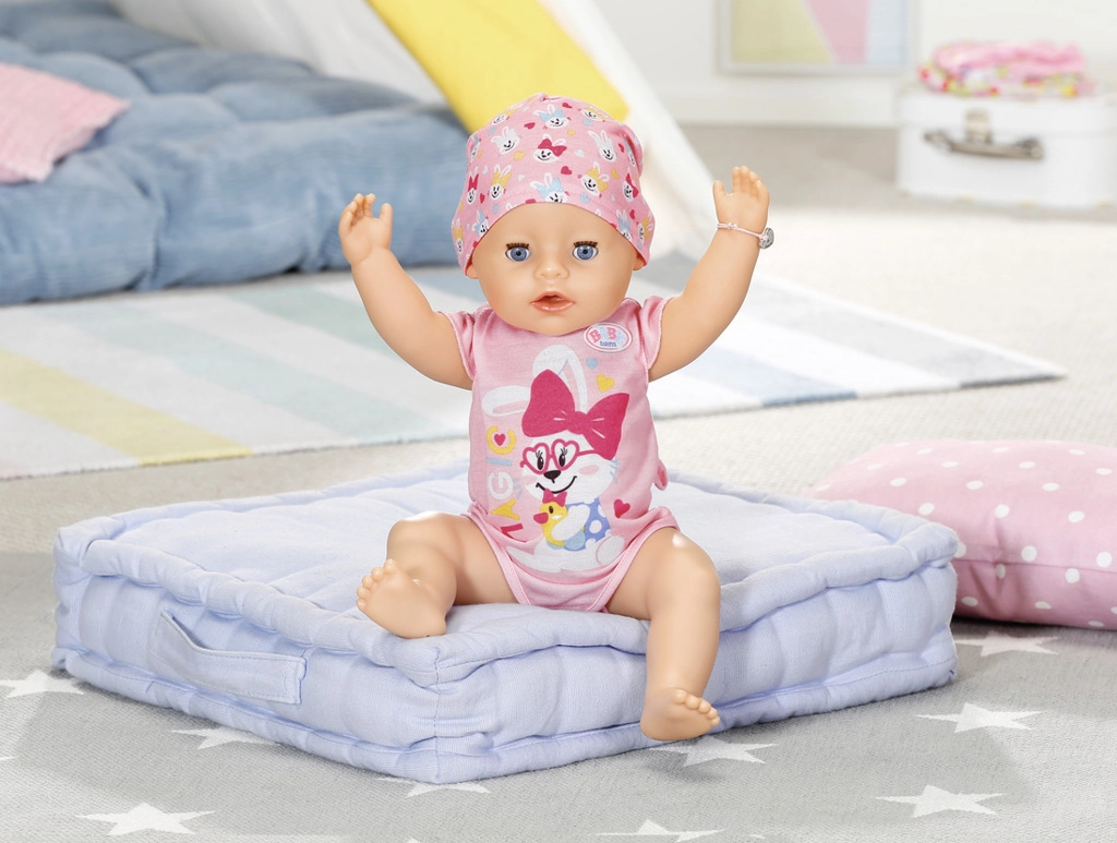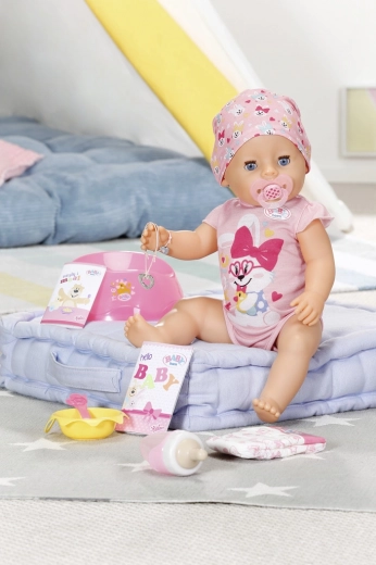 Dukken kan drikke vand fra flasken, spise grød, tisse i bleen og på potten, lave stort og fælde ægte tårer – alt sammen uden batterier. Sættet indeholder 10 tilbehør, der understøtter alle funktioner og inspirerer til udvikling af empati, kommunikation og ansvarlighed.