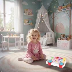 Den musikalske læringsbus begejstrer børn med farvede nøgler, sjove lyde og søde dyr. Hvert af de seks dyr er gemt bag en låge – match nøglen efter tal og farve, og når du drejer, popper dyret op. Legetøjet udvikler naturligt logik, hånd-øje-koordination og kendskab til tal og farver.