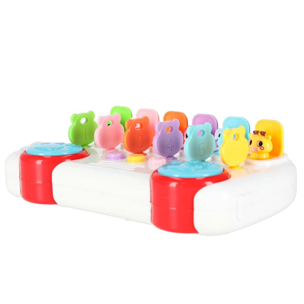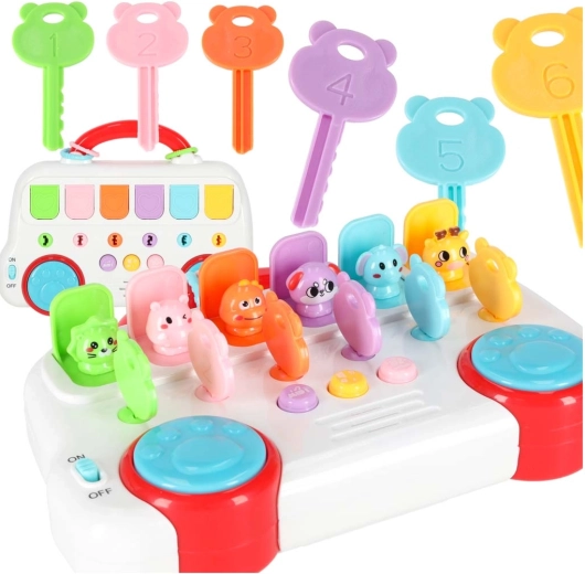 Seks nummererede nøgler i forskellige farver hjælper børn med at matche og skelne. Når du drejer nøglen, popper dyret op, og tallet siges på engelsk.