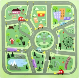 Vejbaner, rundkørsel, parker, sø, bygninger og trafik-elementer stimulerer fantasien og trafikal læring. Ideelt til små biler og figurer.