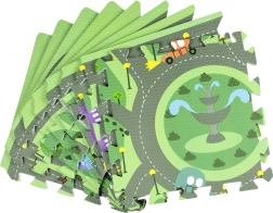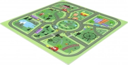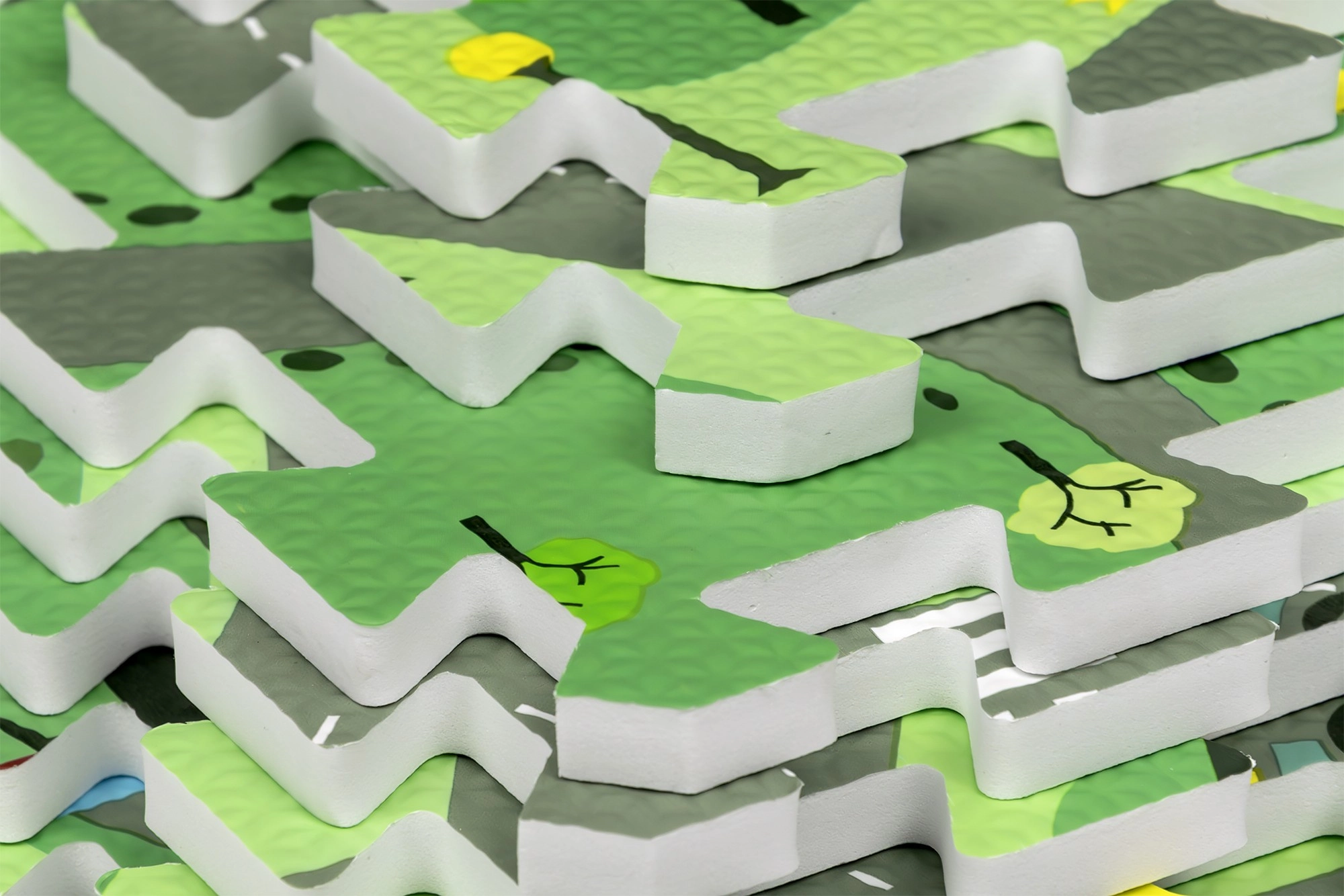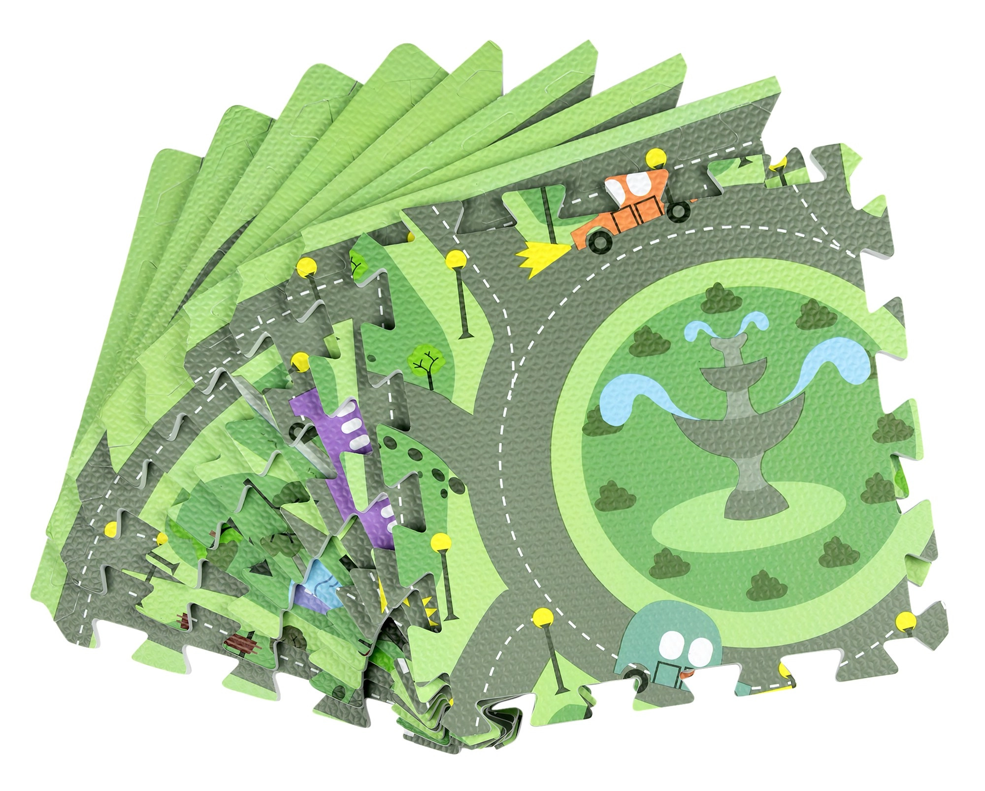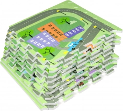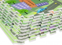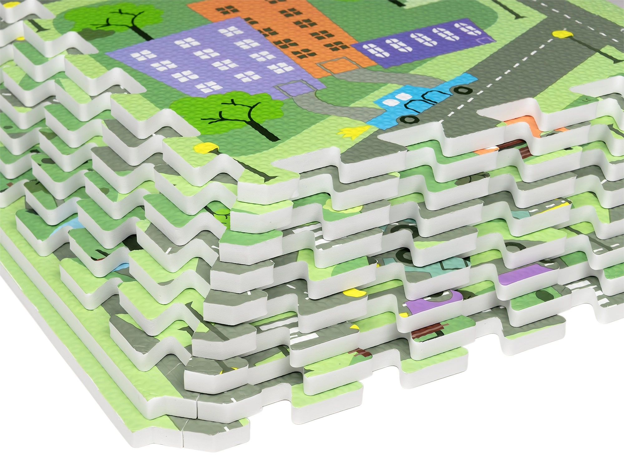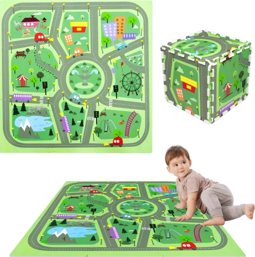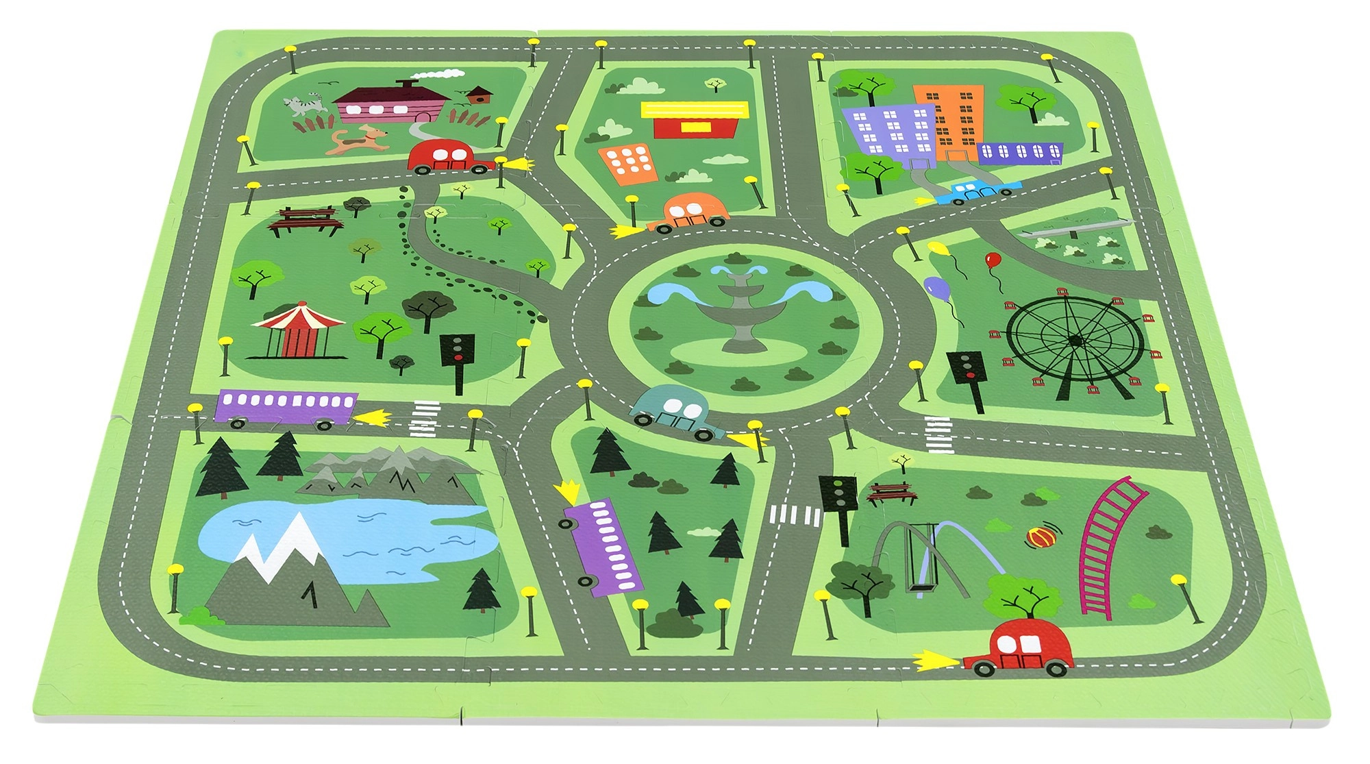 Skab et behageligt og hygiejnisk legeområde til dit barn. Underlaget af elastisk EVA-skum er fri for ftalater, formamid, PVC og BPA, har en skridsikker overflade og fine relieffer for mere sikre første skridt. Det pastelfarvede bymotiv med rundkørsel, parker, sø og bygninger inspirerer fantasien og indbyder til bilbaner og kreativ leg med figurer.