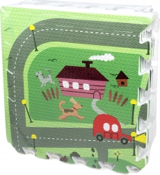 Blødt og sikkert skumunderlag til børn med bymotiv, måler 90 × 90 × 1 cm og består af 9 store dele af EVA-skum. Ideelt til den første leg, krybning og gang – det isolerer mod kulde, dæmper fald, er vandafvisende, nemt at rengøre og kan udvides eller samles til 3D-former takket være puzzlesystemet. Certificeringerne EN 71, REACH og CE sikrer sikker brug fra fødslen.