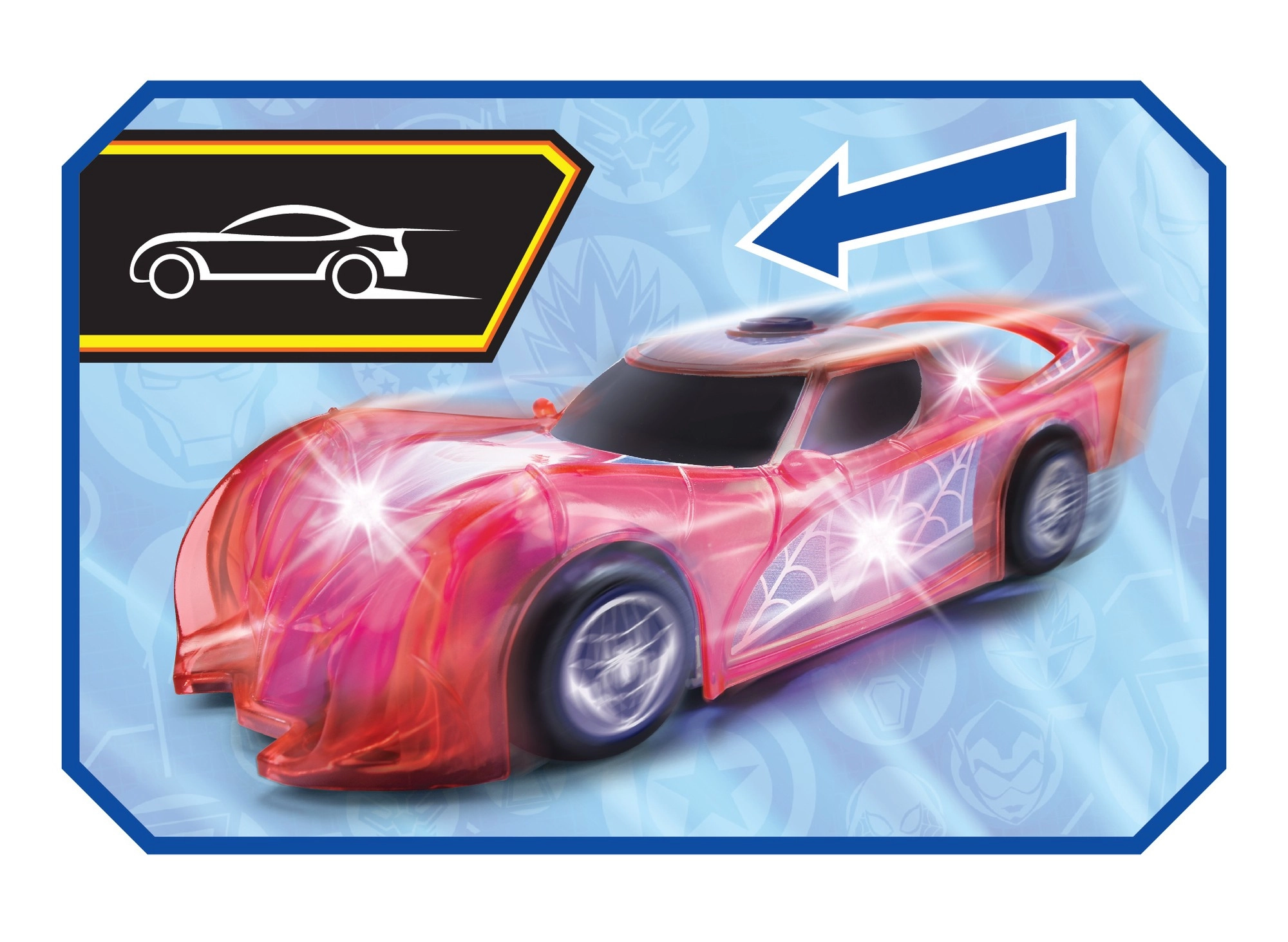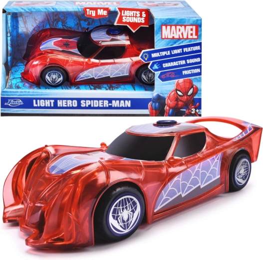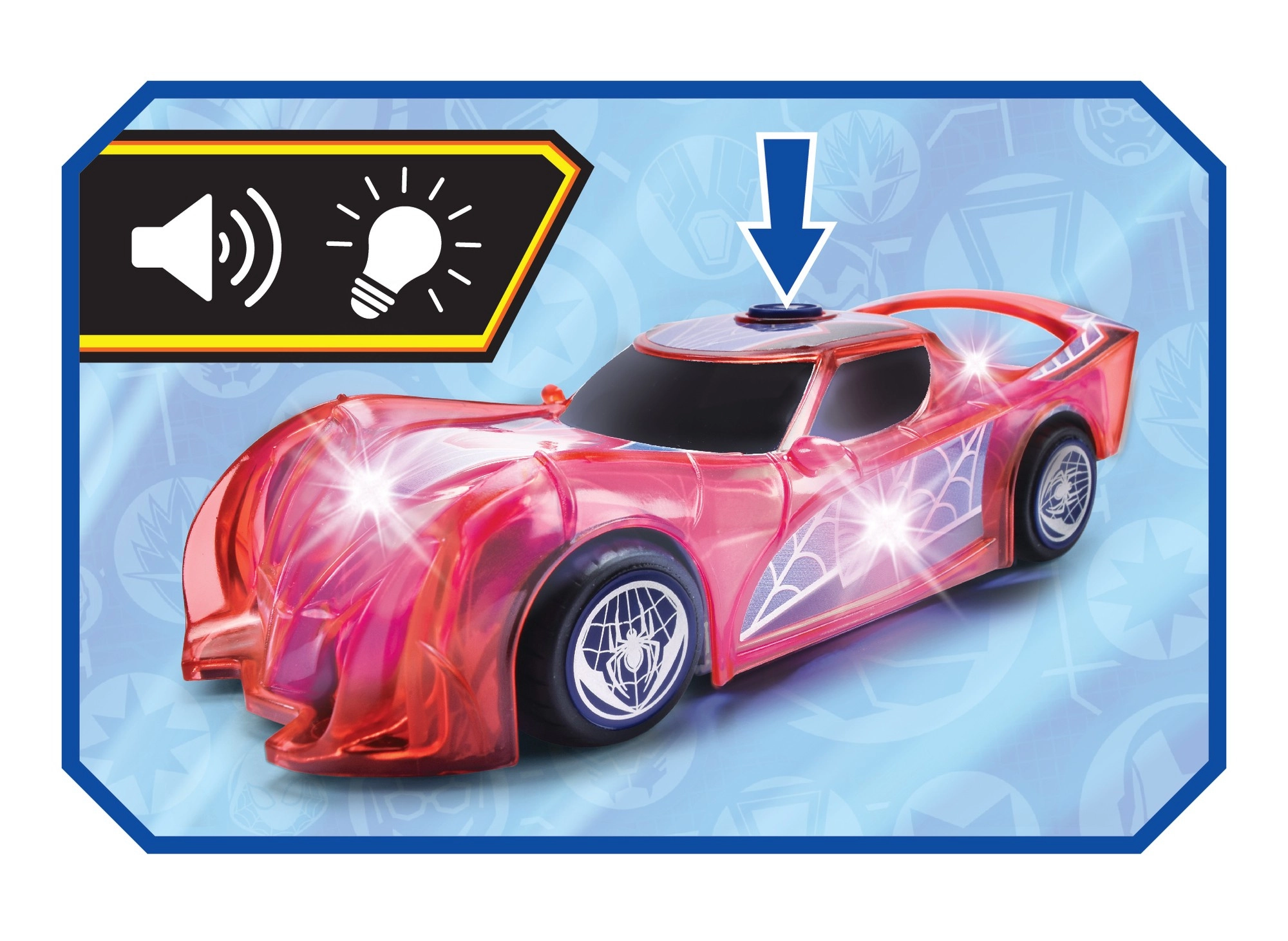 En stilfuld bil inspireret af helten SPIDER‑MAN fra MARVEL-universet, som glæder børn med lys- og lydeffekter og den lette friktionsdrev. Den gennemsigtige karrosseri med spindelnætsmotiv, aerodynamisk spoiler og robuste hjul sikrer actionfyldt kørsel og fantasi ved leg med superheltescener.