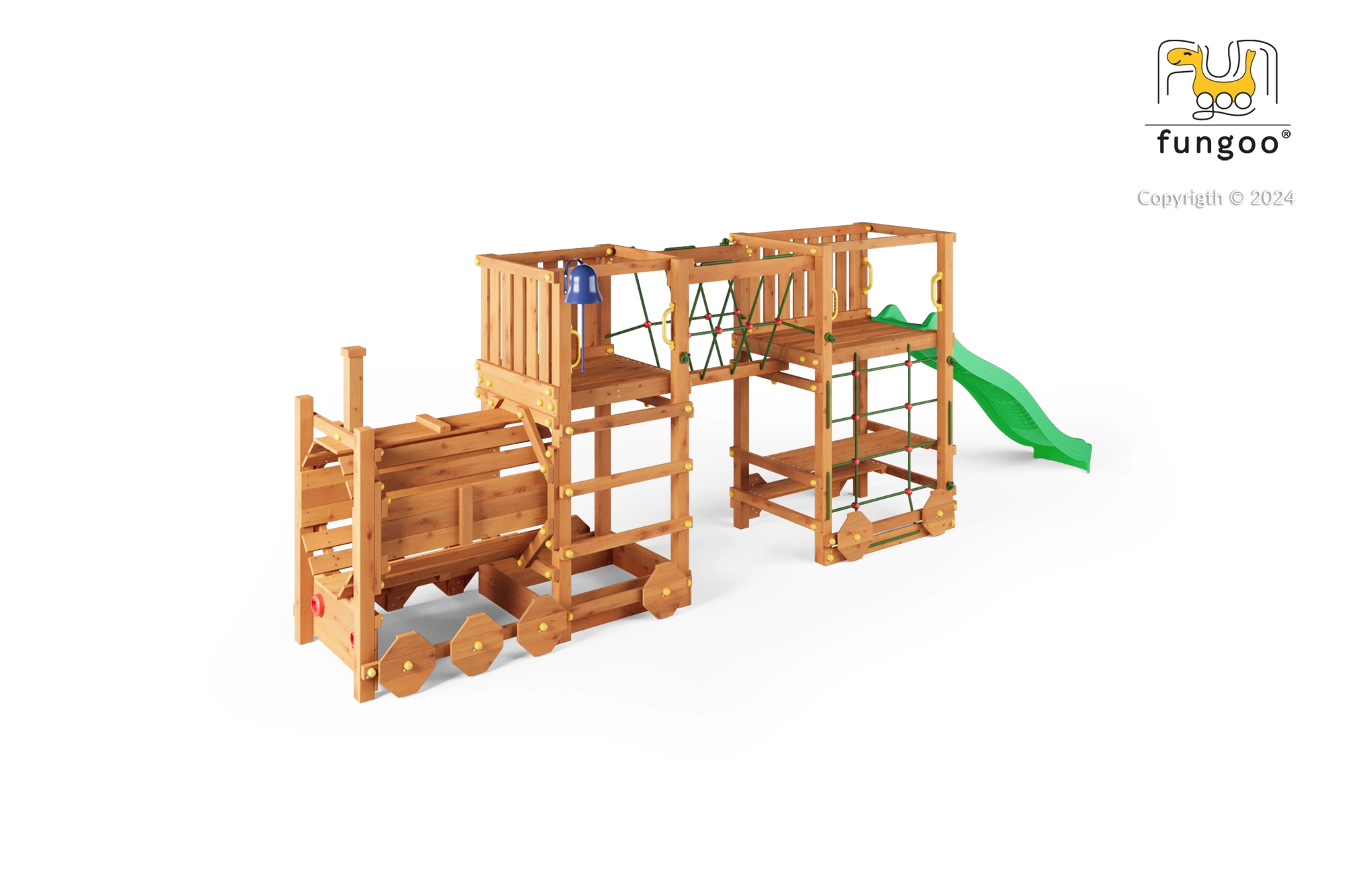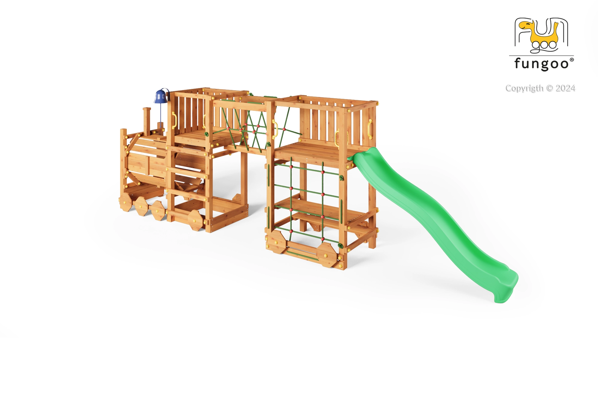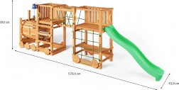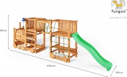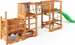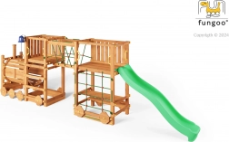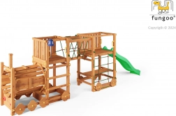 Legepladsen FUNGOO Loco Express kombinerer en sikker trækonstruktion med et fængende togtema, der stimulerer fantasien. Børn kan klatre, rutsje, gå gennem lokomotivtunnelen og slappe af ved picnicbordet under platformen. Takket være kvalitetstræ med imprægnering er sættet stabilt, holdbart og ideelt til heldagsleg i det fri.