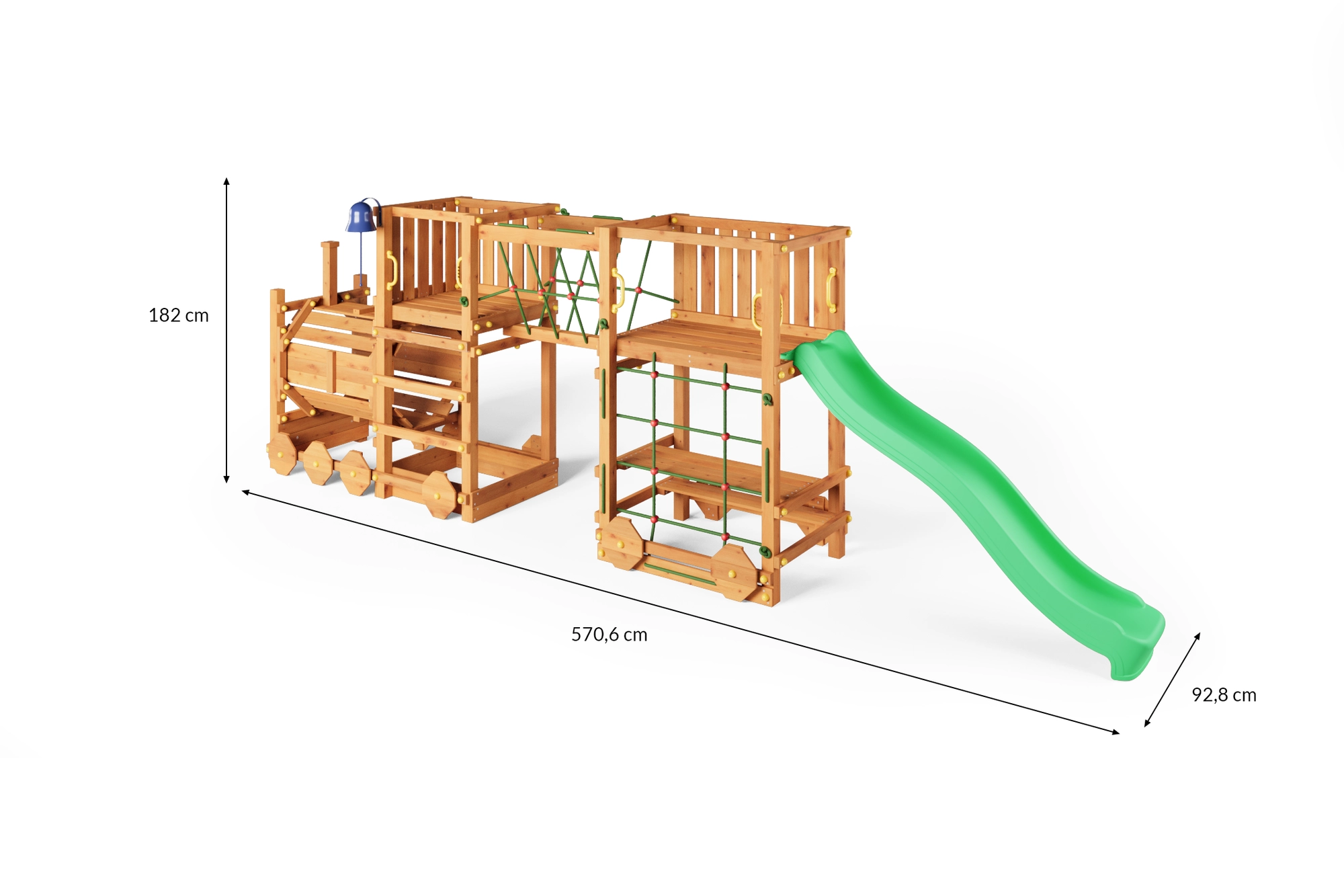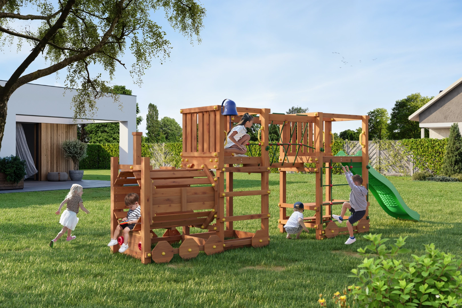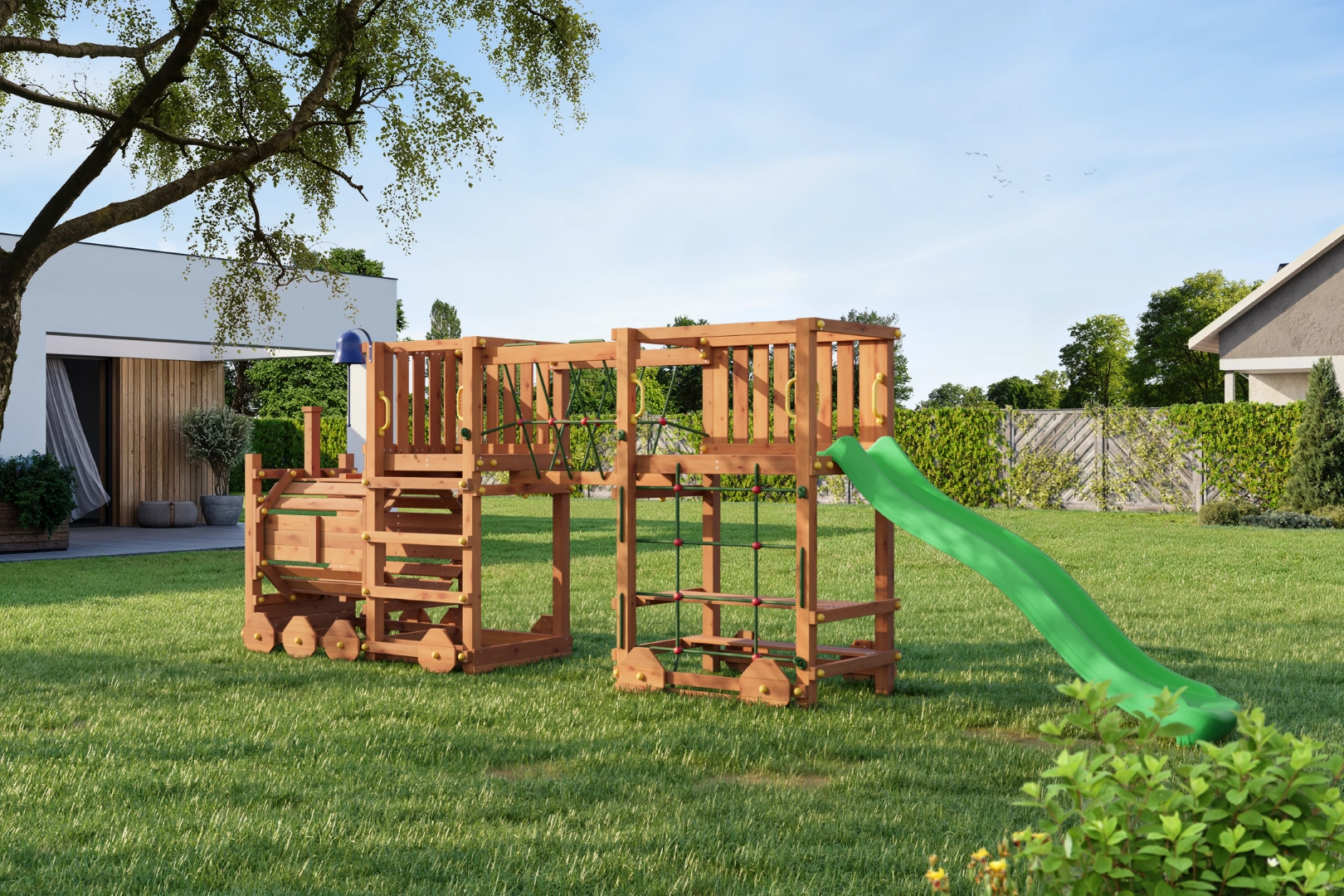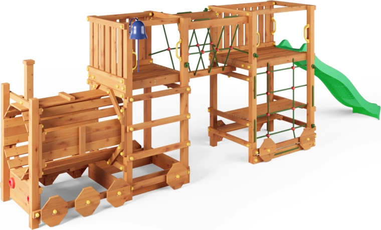 Den gennemtænkte udrustning forbedrer smidighed, balance og koordination. Tovbro og klatrenet udvikler motorikken, rutsjebanen på 2,2 m giver hurtig sjov, og greb og jordankre sikrer tryghed under brug. Legepladsen er velegnet til private haver for børn fra 3 år og op til 50 kg pr. bruger.