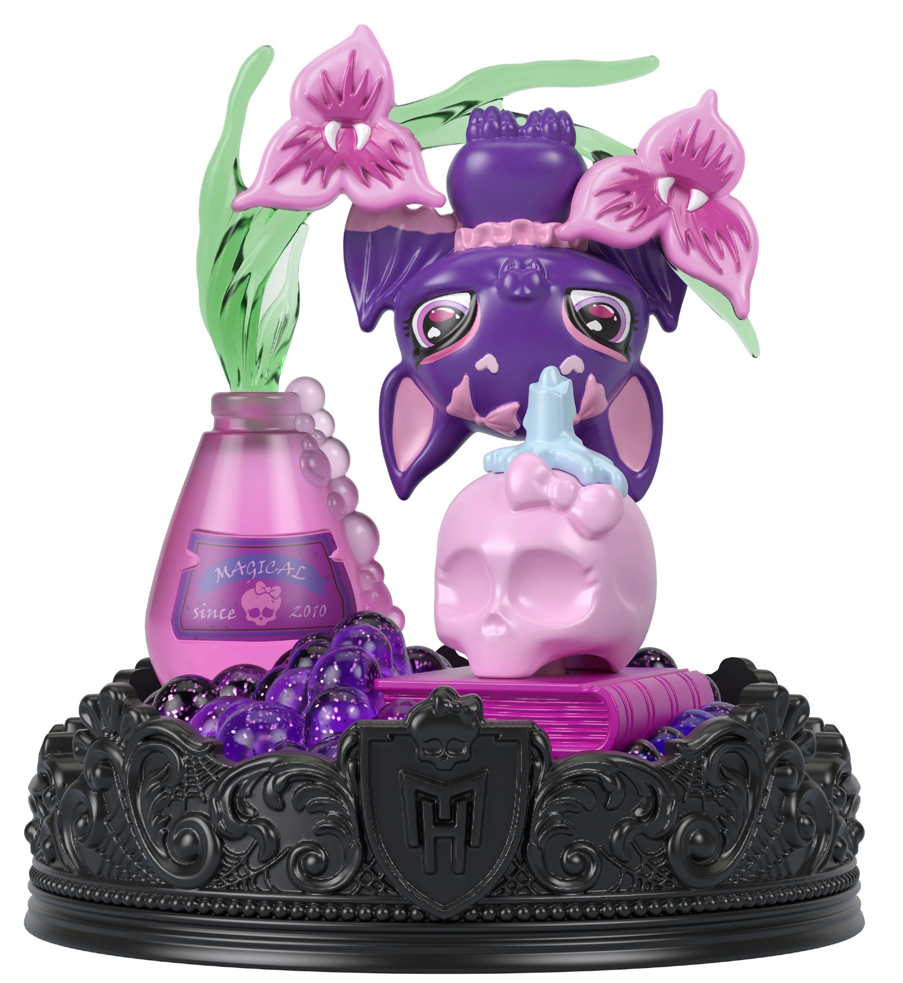 En mørkelilla flagermus med lyserøde accenter og MONSTER HIGH-emblem er klar til at pynte din rygsæk, penalhus eller hylde.