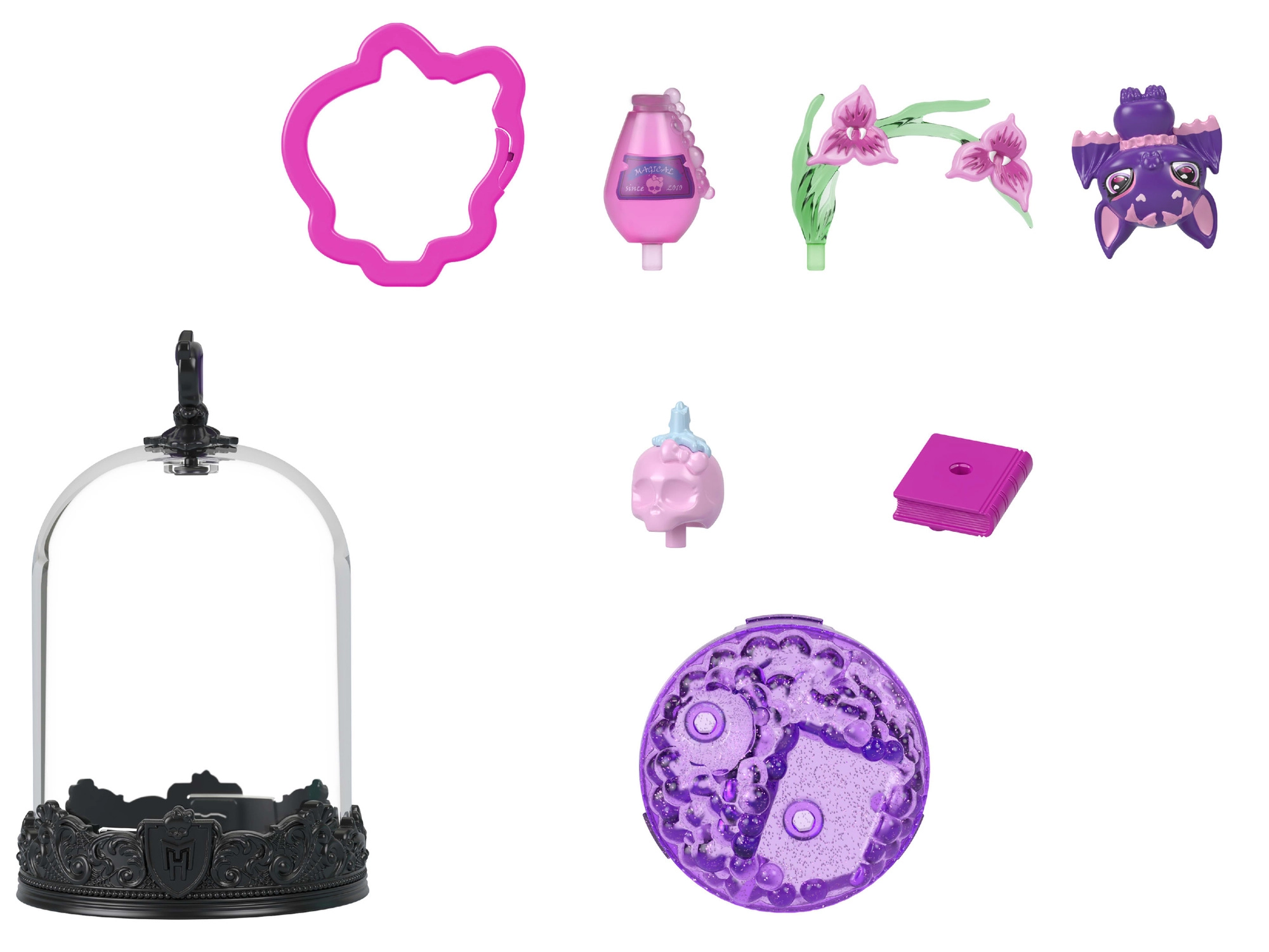 Træd ind i den stilfulde MONSTER HIGH-verden med et vedhæng, der forener leg, kreativitet og udstilling på ét sted. Inde i den klare kuppel skaber du en scene til Count Fabulous – den ikoniske lille flagermus – med tematiske dekorationer. Det færdige terrarium klikker du nemt sammen og fastgør med klipsen, så din lille ledsager kan tage med overalt.