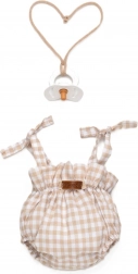 Beige-hvid ternet romper med bindestropper, elastiske benåbninger og rynket talje sidder sikkert på dukken og ser fantastisk ud på billeder.