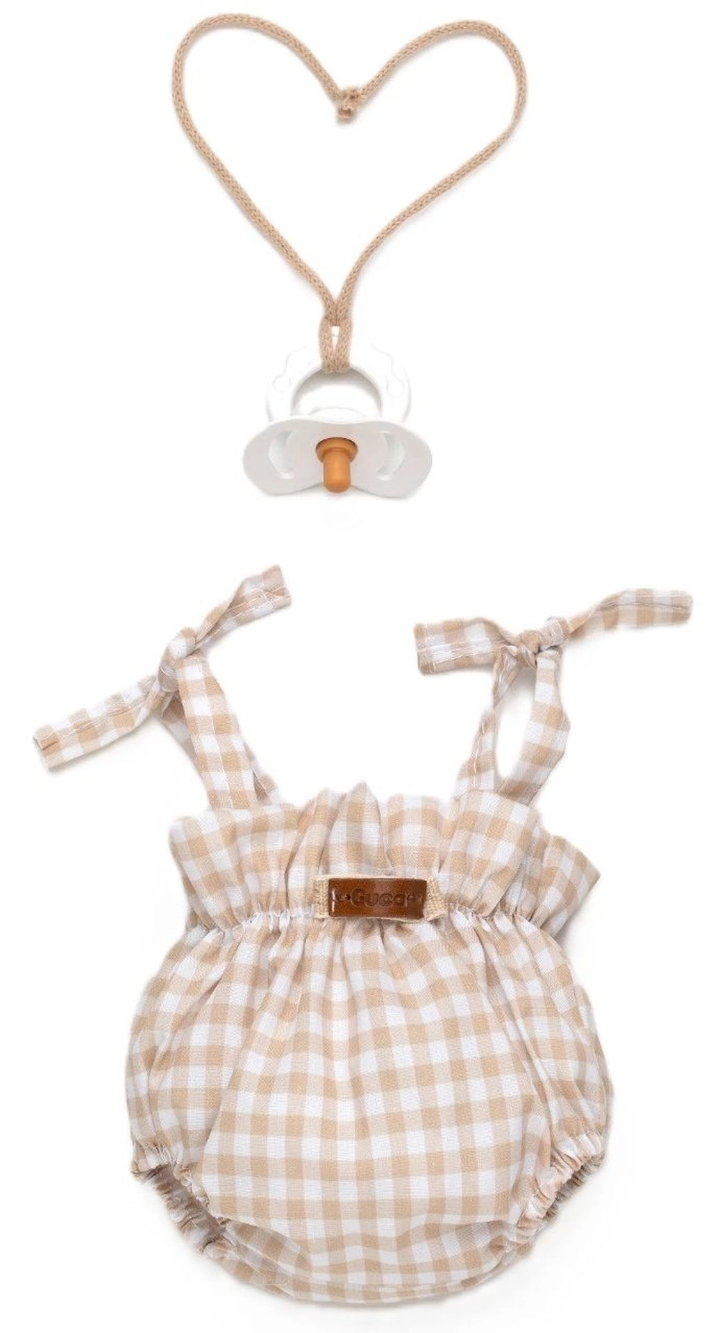 Giv din abe-baby REBORN et nyt look med dette omhyggeligt udformede sæt. Den bløde ternede romper med justerbare stropper og elastiske kanter gør det nemt at klæde på og behageligt at have på. Sættet inkluderer også en stilfuld sut på snor, som fuldender det søde udtryk og stimulerer fantasifuld leg.