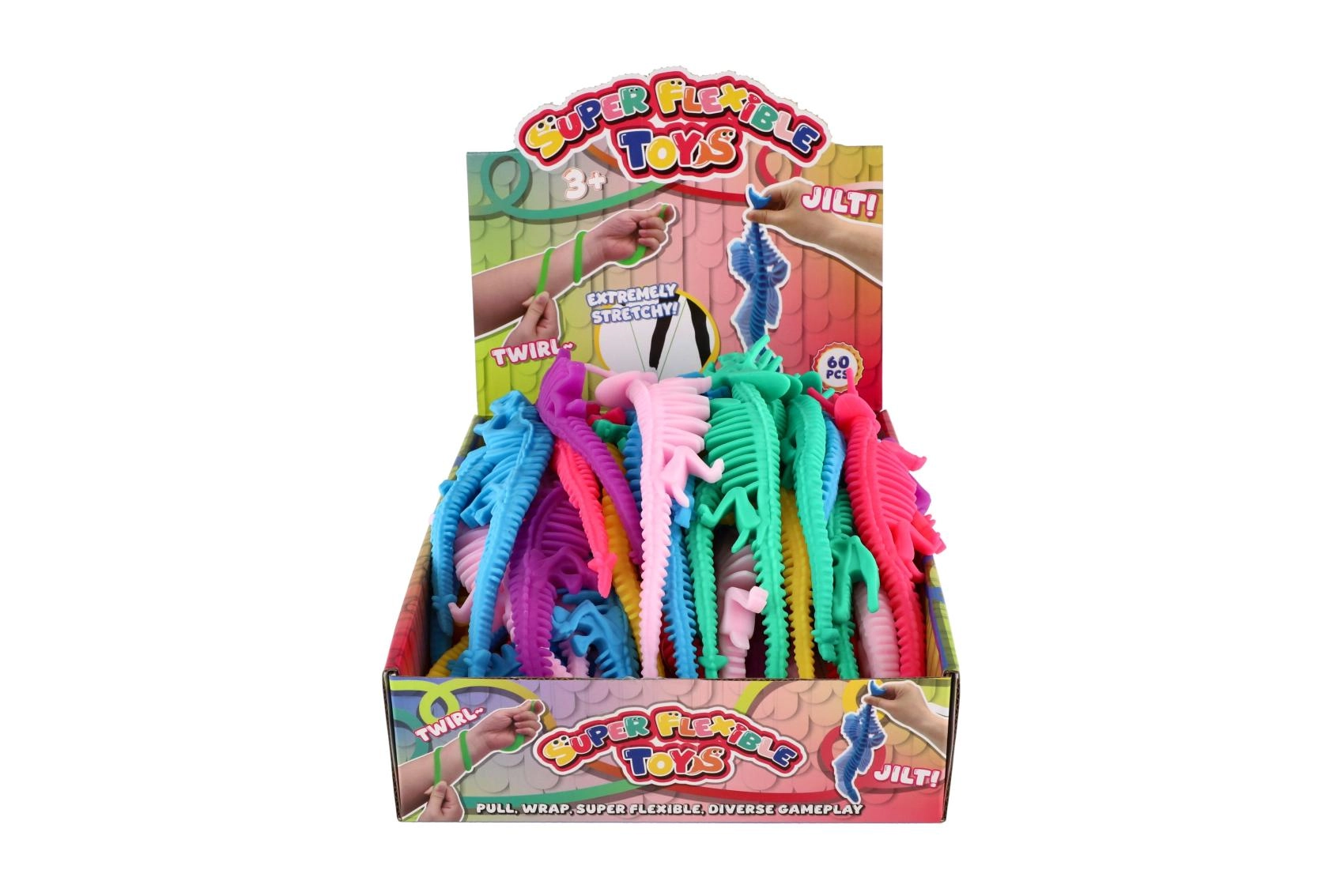 Farverigt antistress-legetøj formet som et dinosaurus-skelet af behageligt blød silikone, ideelt til at klemme, strække og finde ro i stressede situationer. Længde 22 cm, fås i 6 iøjnefaldende farver, perfekt til både børn og voksne som en fidget-legeting til at frigøre spændinger.