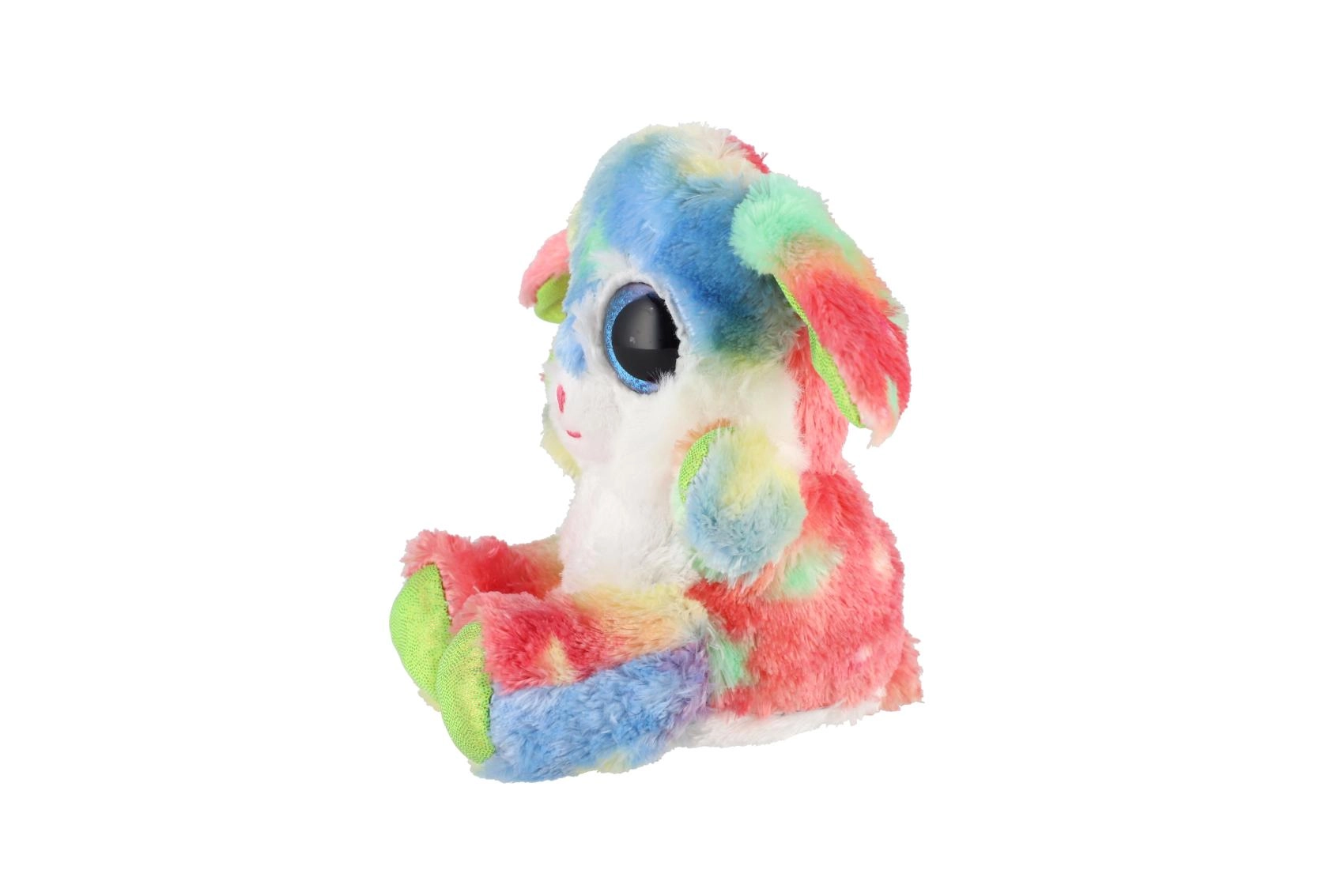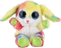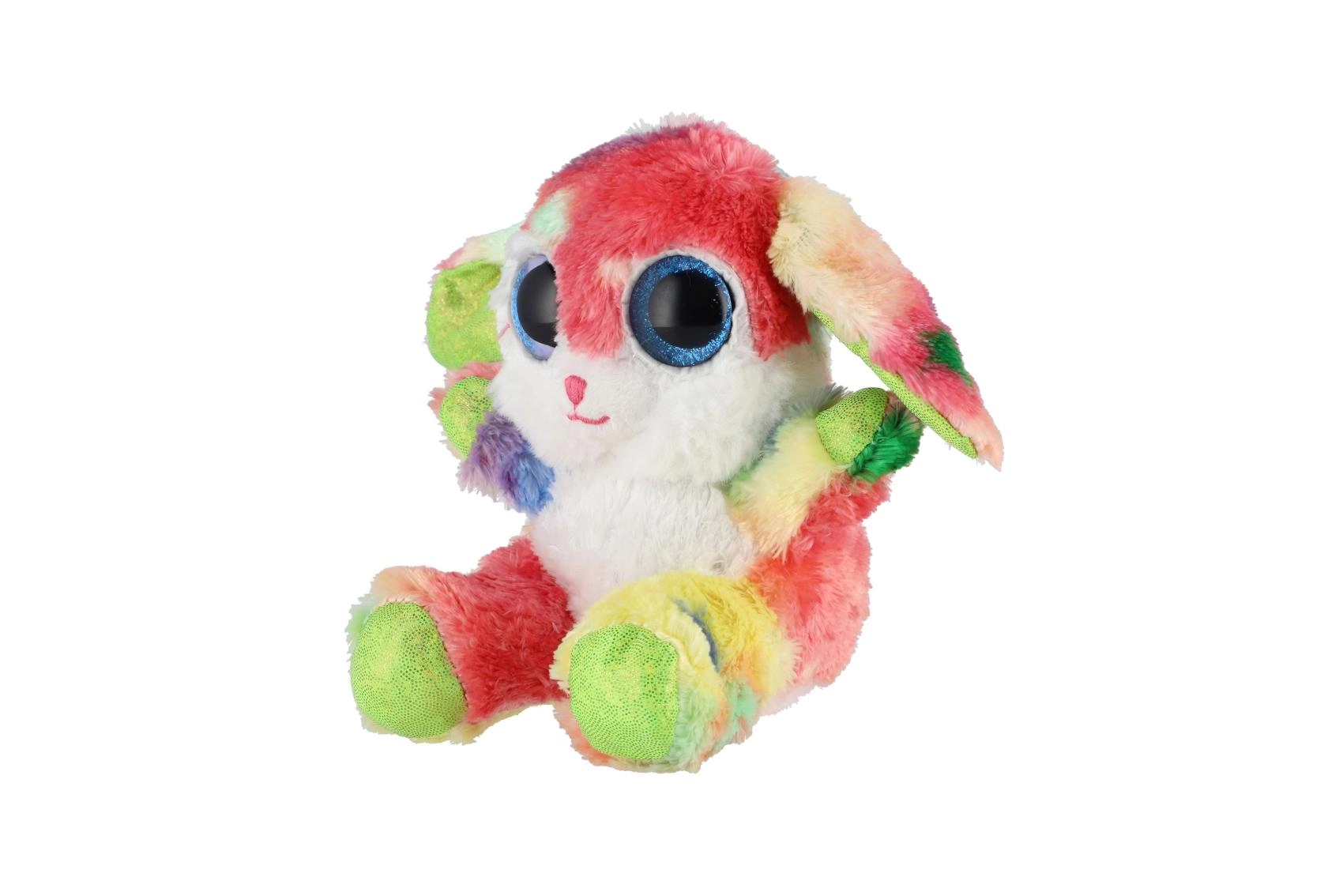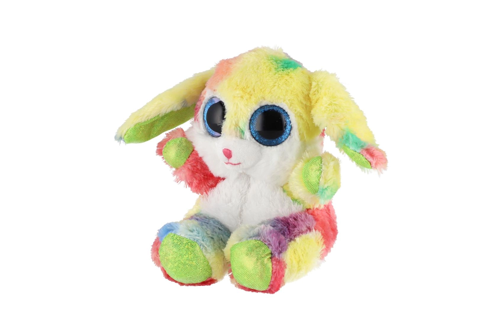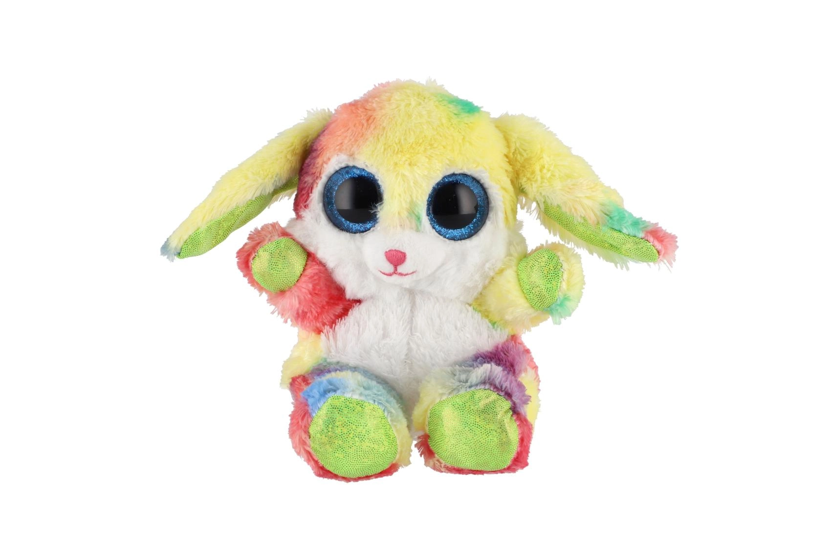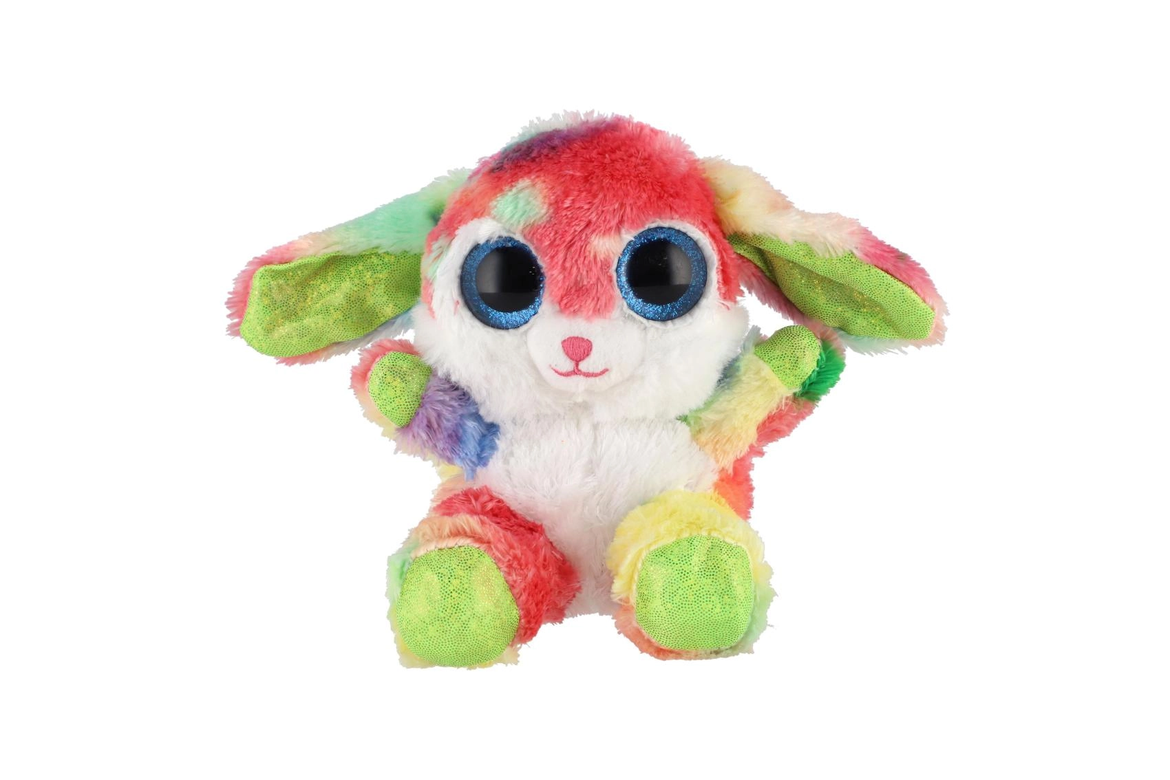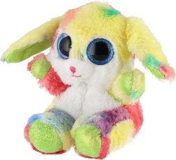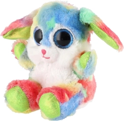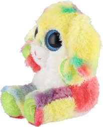 En sød, siddende kanin i regnbuefarver med store glitrende øjne er den ideelle krammeven til børn. Den er lavet af ekstra blød plys, har lange, bøjelige ører og en kompakt størrelse på 15 cm, så den er nem at tage med i sengen, i rygsækken eller på farten.