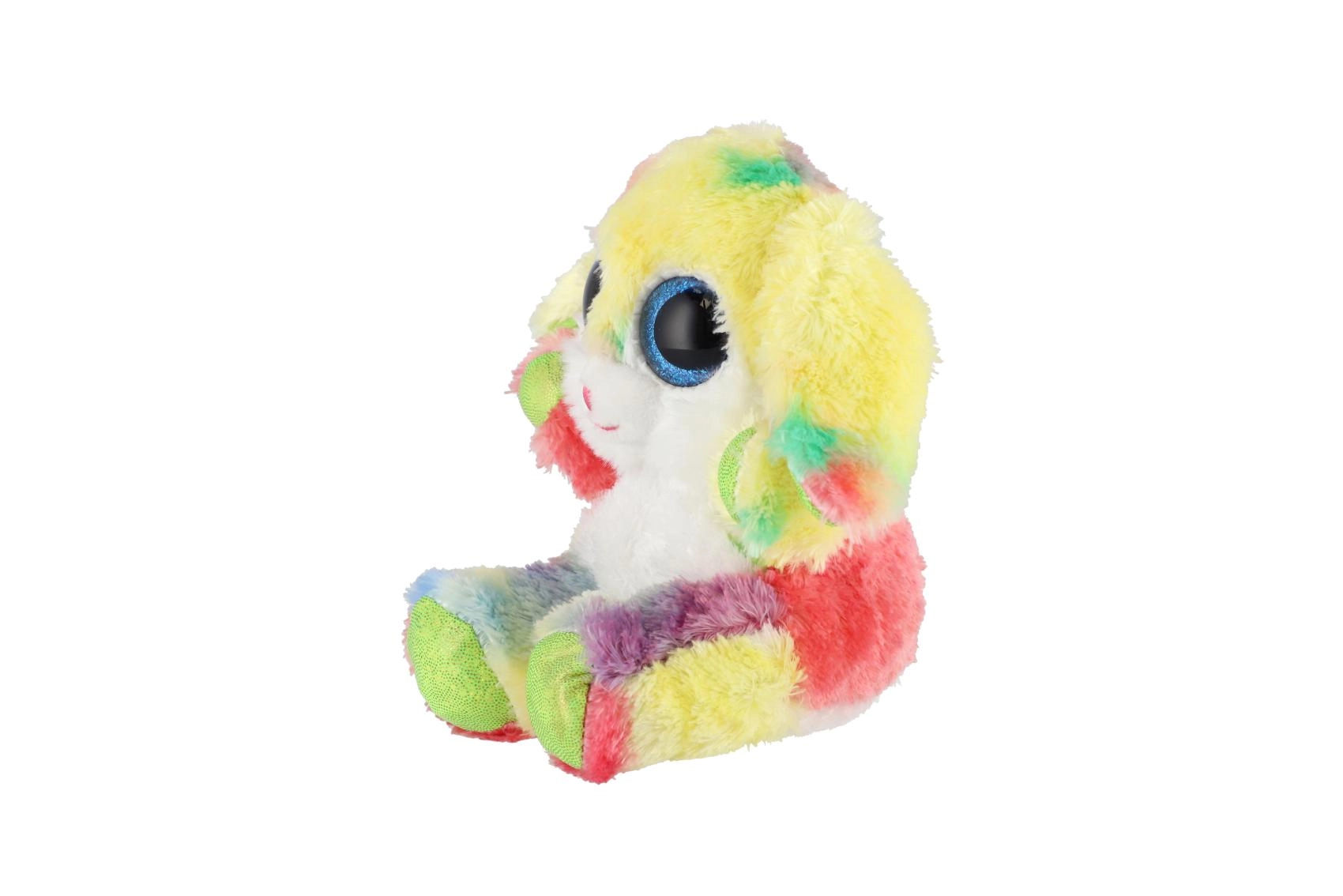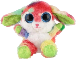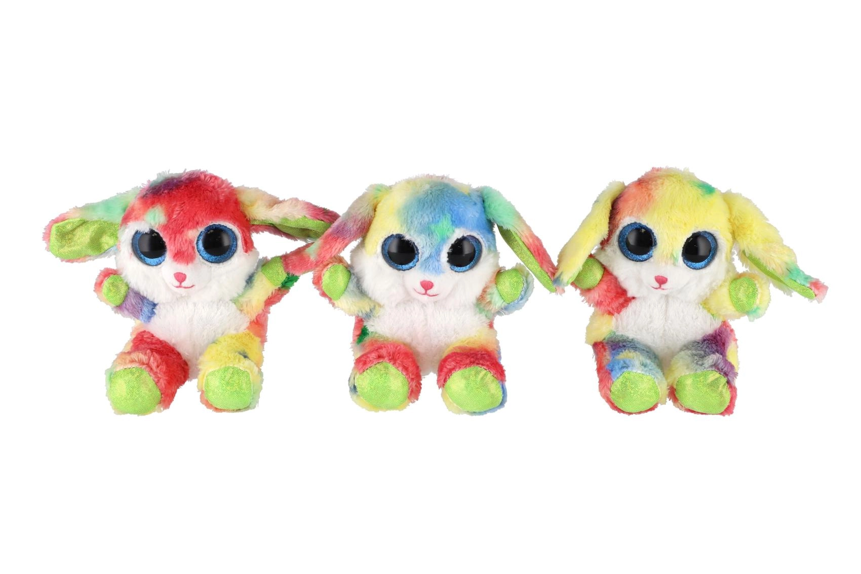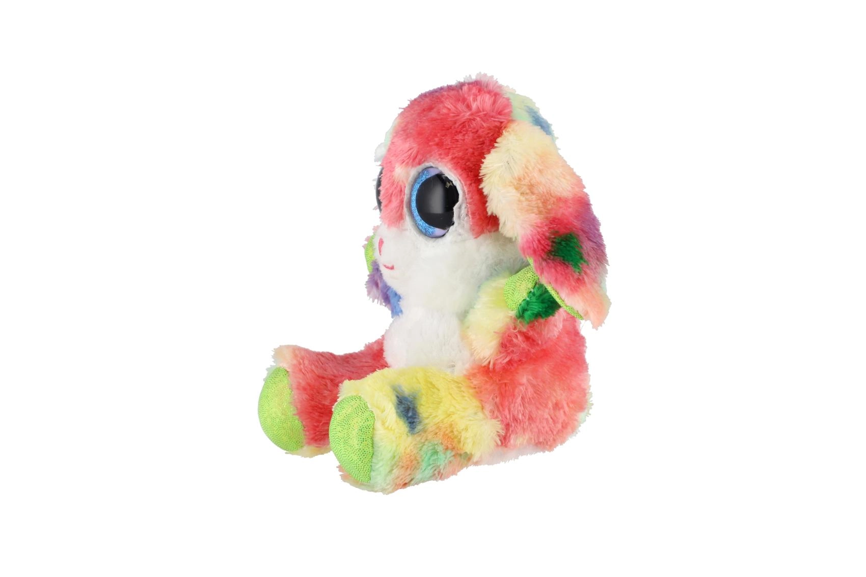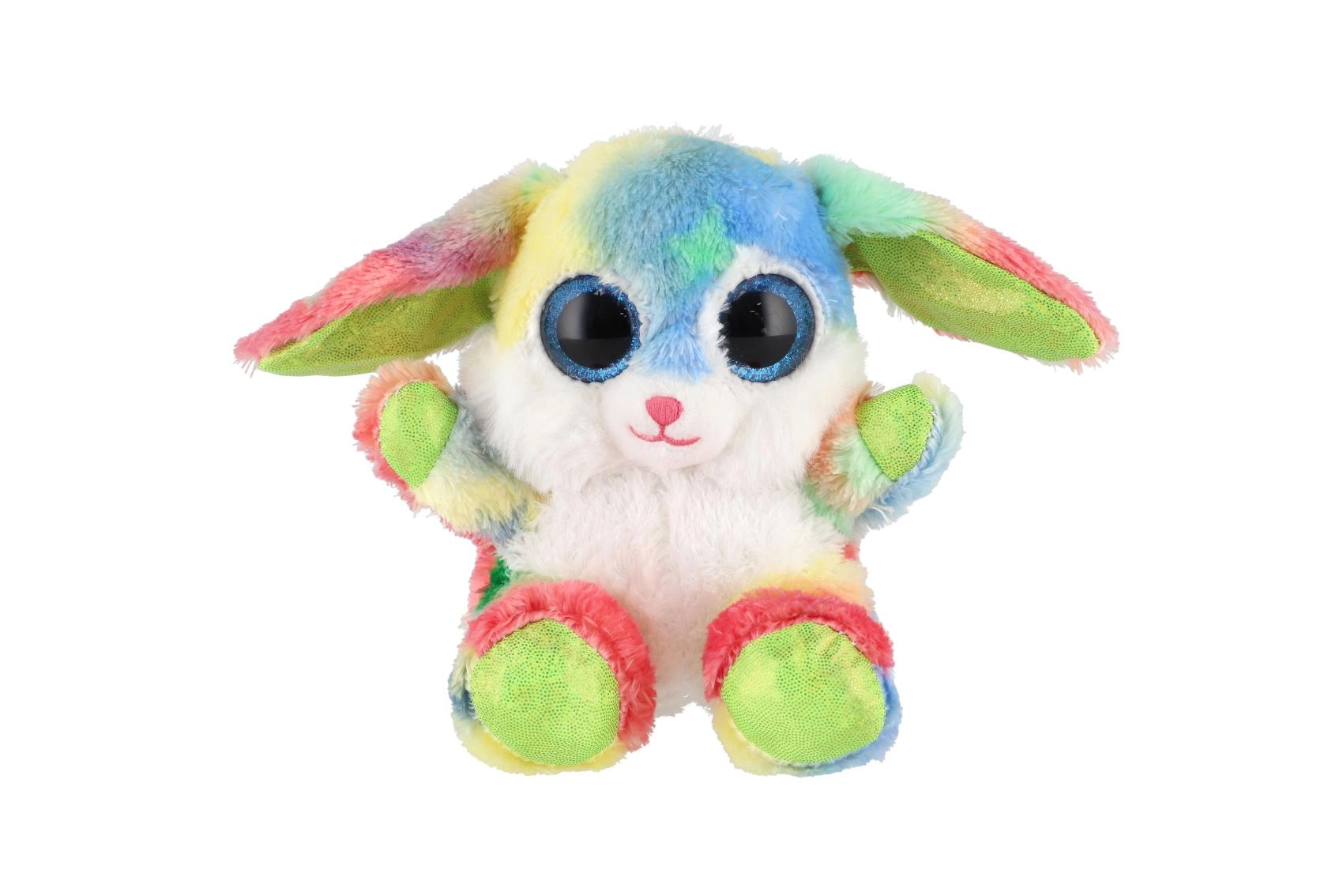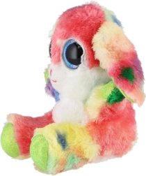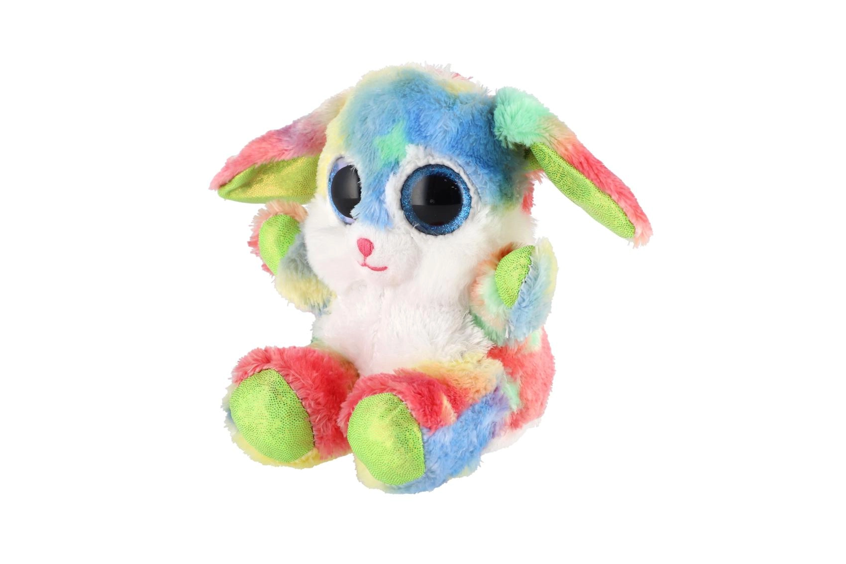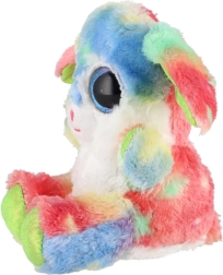 En sød, siddende kanin i regnbuefarver med store glitrende øjne er den ideelle krammeven til børn. Den er lavet af ekstra blød plys, har lange, bøjelige ører og en kompakt størrelse på 15 cm, så den er nem at tage med i sengen, i rygsækken eller på farten.