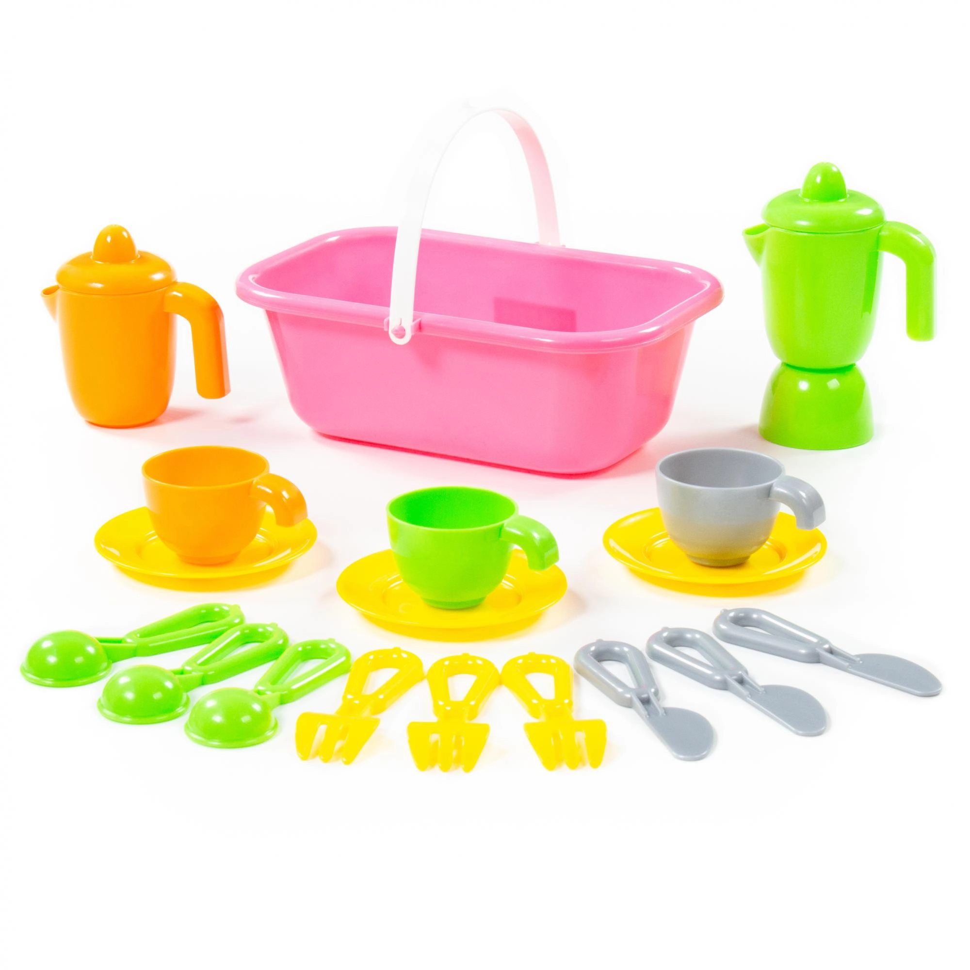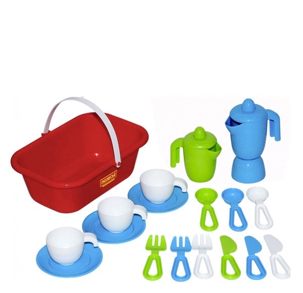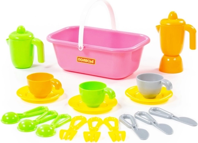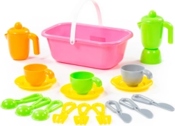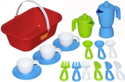 Stilfuldt børneservicesæt Topchef med kurv til 3 personer indeholder alt, hvad små kokke har brug for til rolleleg i køkkenet. Sættet består af 18 dele, er fremstillet af kvalitets- og sikre materialer fra Wader-Polesie Toys og er ideelt til legekøkkener og fælles leg. Farvekombinationer kan variere afhængigt af aktuel tilgængelighed.