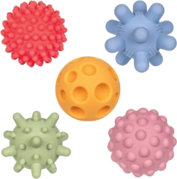 Sættet med fem bløde sensoriske bolde i pastelfarver er designet til de allermindste fra 0+. Hver bold har en anderledes tekstur for rig taktil stimulering – fra fine forhøjninger til mere markante knopper. Takket være konstruktionen uden huller samler der sig hverken vand eller snavs indeni, hvilket er hygiejnisk og velegnet også til badet.