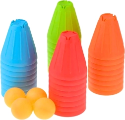 Dette færdigheds- og læringsspil tilbyder uendelige muligheder for byggeri og leg. Børn kan af farvede trekantede kopper skabe tårne, pyramider og forhindringsbaner, øve balance og præcision eller kaste bolde i udvalgte mål. Den skridsikre overflade med fin perforering sikrer et sikkert greb og stabilitet i konstruktionerne.