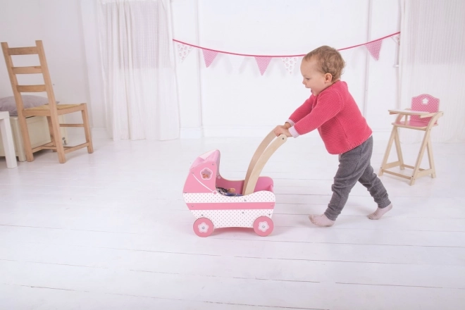 Denne smukke lyserøde barnevogn til dukker er udstyret med en stofkalesje og dekorative udsmykning, der vil glæde enhver lille pige. Legetøjet hjælper med at udvikle kreativitet og sociale færdigheder hos børn.