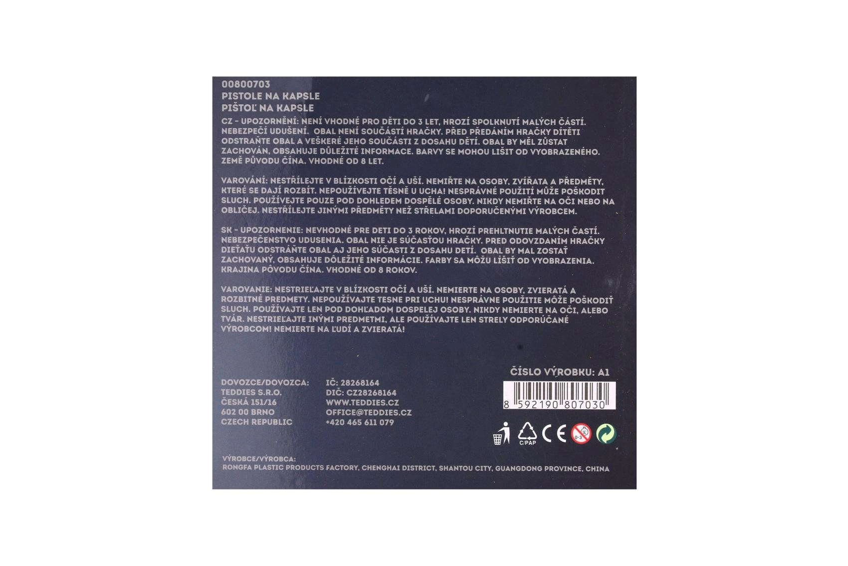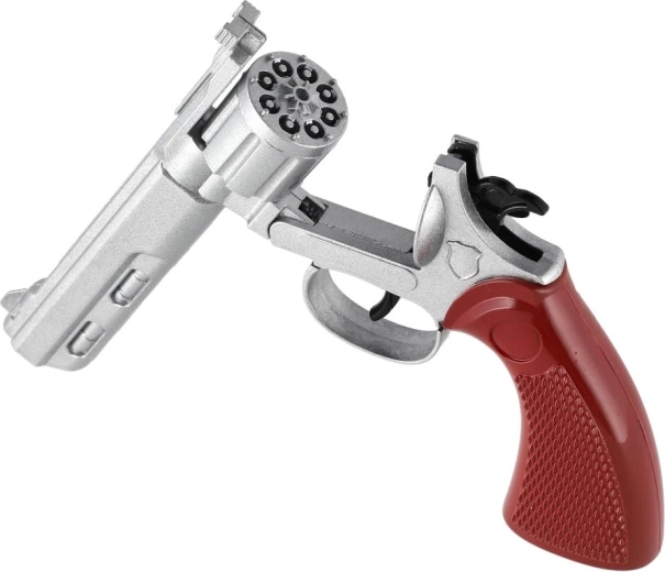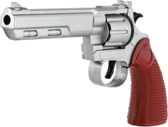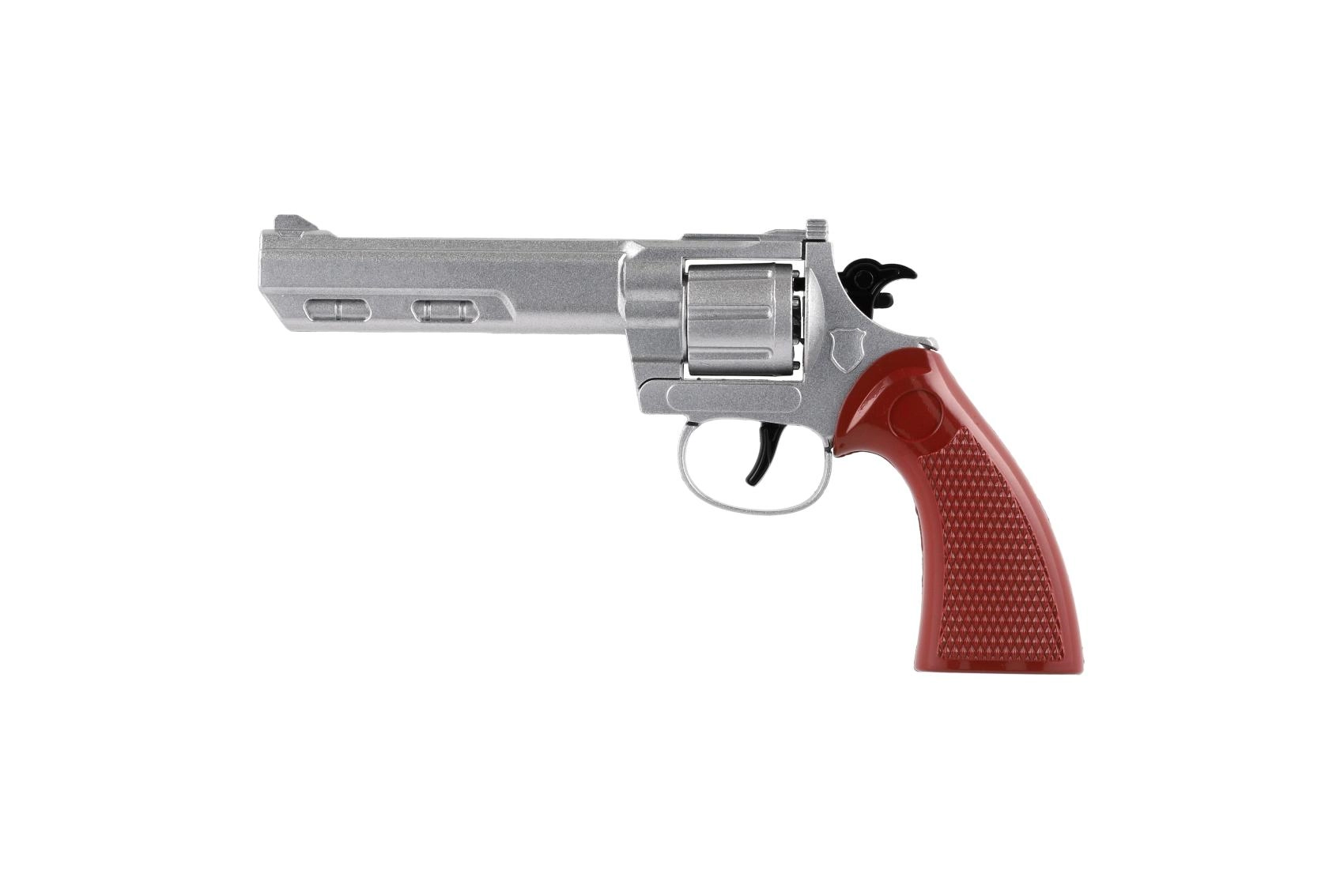 Denne stilfulde 22 cm revolver giver et autentisk udseende og pålidelig funktion til børneleg. Den metalske krop virker realistisk, mens lydeffekten ved brug af 8‑skuds kapsler forstærker stemningen af eventyr. Takket være det ergonomiske greb ligger pistolen godt i hånden, også ved længere tids leg.