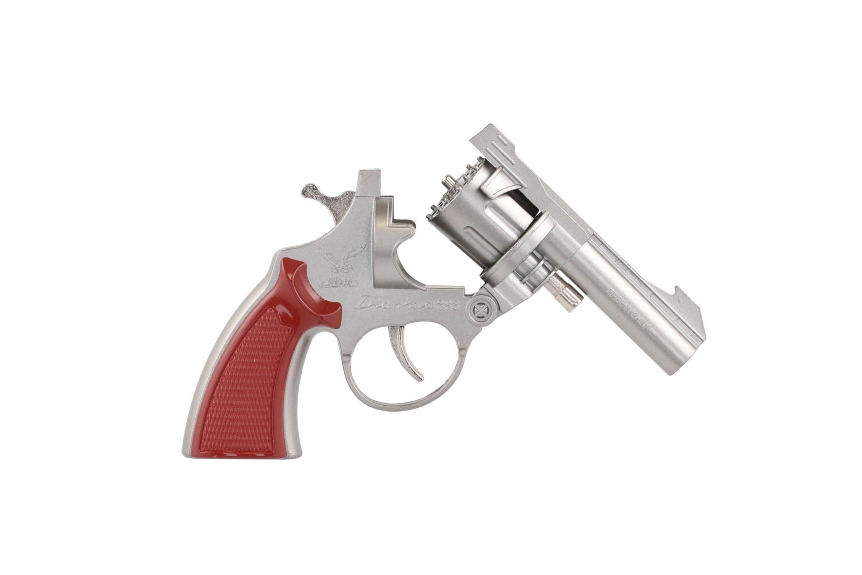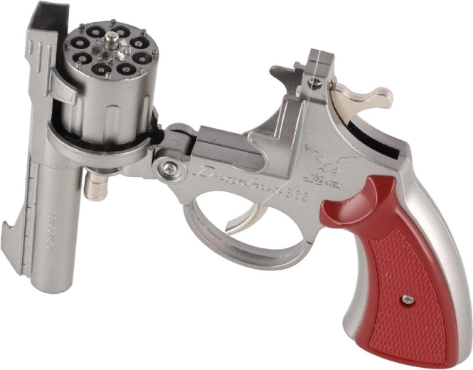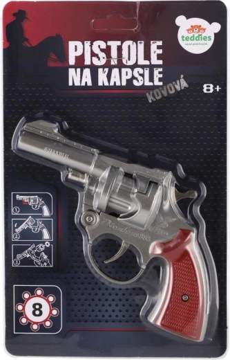Denne metalpistol til knaldhætter giver en autentisk legefølelse uden risiko. Tromlen er beregnet til 8-skuds knaldhætter, som ved tryk på aftrækkeren skaber en lydeffekt. Den robuste metalkonstruktion og det behagelige greb sikrer lang holdbarhed og komfort i hånden.