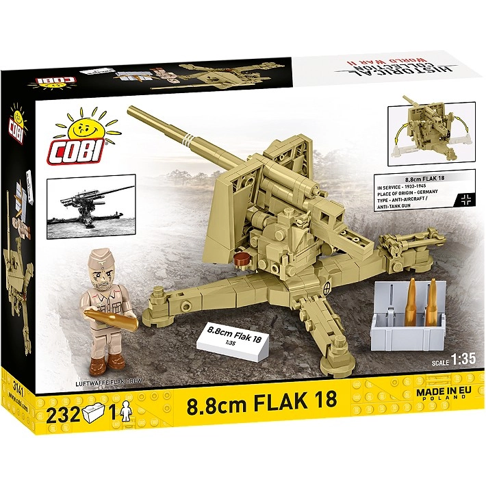 Byg den ikoniske kanon 8,8 cm Flak 18 i realistisk skala 1:35. Sættet indeholder 232 klodser, detaljerede bevægelige elementer (elevation, 360° rotation, nedklappelige støtter), en minifigur af artillerist og samler-tilbehør. Ideelt til fans af historiske modeller, udstilling og actionfyldt leg.