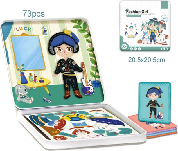 Dette stilfulde sæt giver børn uendelige muligheder for påklædning og kombinationer. Med 62 brikker kan de skabe deres egne modekreationer, lade sig inspirere af mønstrekortene og finpudse accessories eller tøjdets detaljer med den medfølgende tør-slet tusch. Den robuste metalkasse er praktisk til opbevaring og transport, så sættet passer til hjemmet, udflugter og ferie.
