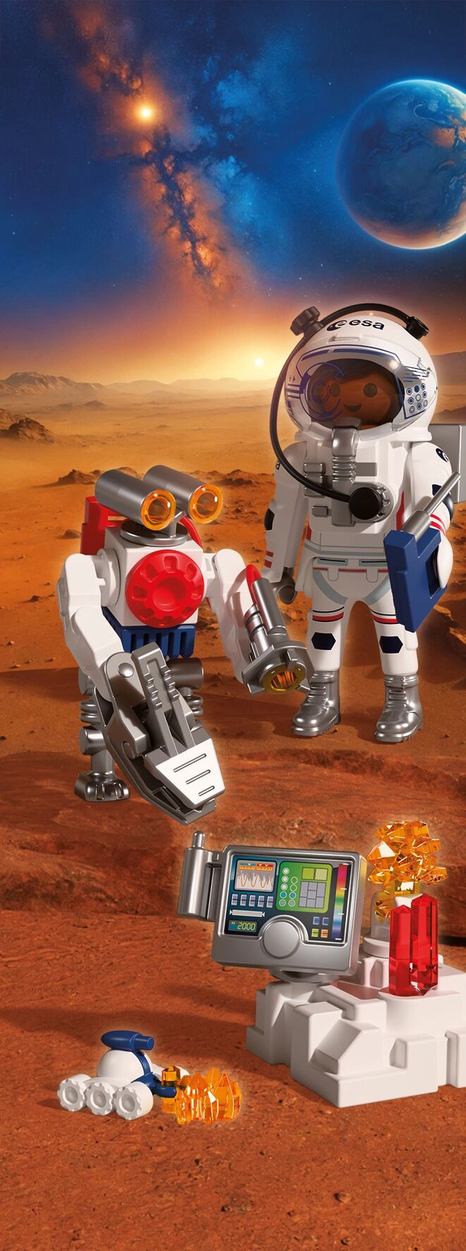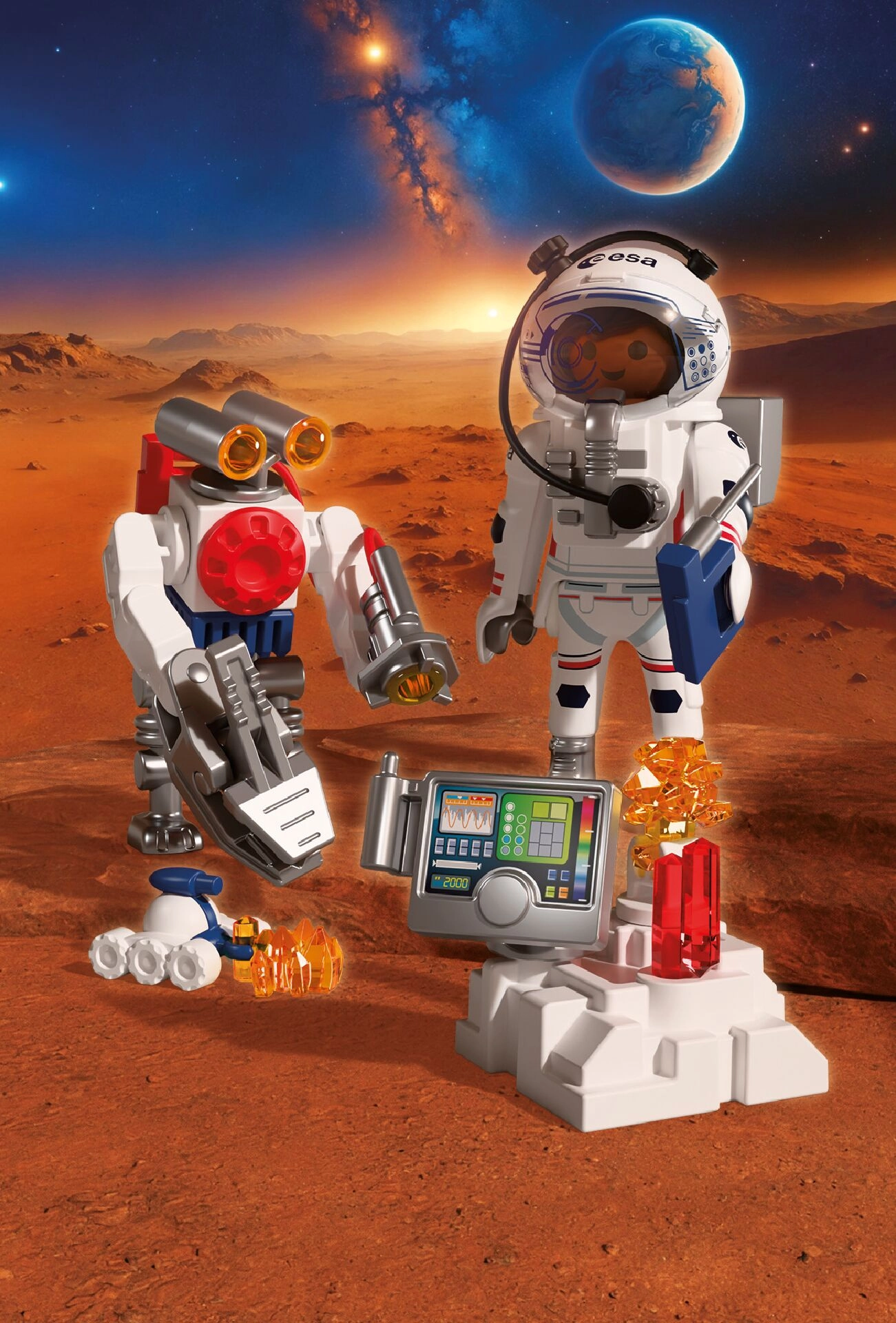 Oplev autentiske rum-eventyr med PLAYMOBIL i samarbejde med ESA. Astronauten udforsker den røde planets overflade ved hjælp af en adræt robot og en alsidig rover, indsamler jordprøver og opfanger mystiske signaler fra Mars’ indre. Den bevægelige, gribende robotarm gør det let at løfte fund, mens skorpionlignende roveren når frem selv til svært tilgængelige steder.