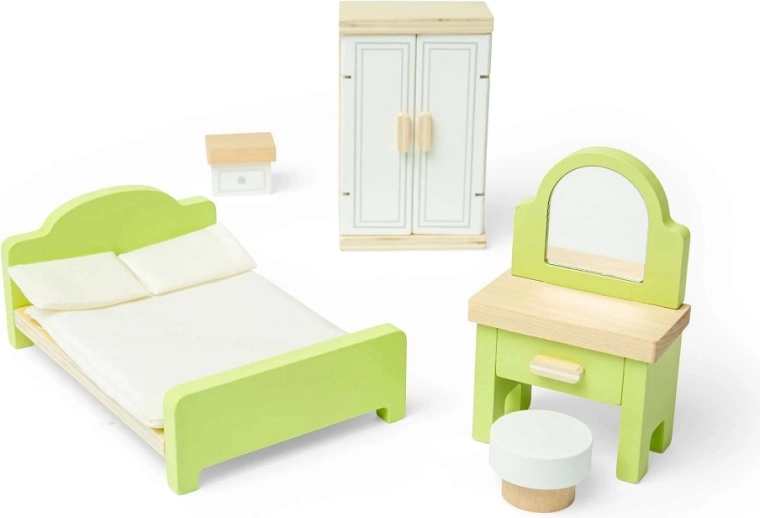 Skab et hyggeligt fristed til dine dukker med det elegante træ-soveværelsessæt fra BIGJIGS TOYS. Sættet indeholder seng, garderobeskab, natbord, toiletbord og skammel – alt lavet af FSC®-certificeret træ af høj kvalitet. Understøtter fantasi, rollespil, empati og efterligning af aftenritualer. Takket være åbne-/lukkedøre og skuffer samt en glat, lakeret overflade er det ideelt til daglig leg og kompatibelt med BIGJIGS TOYS dukkehuse og andre standarddukkehuse.