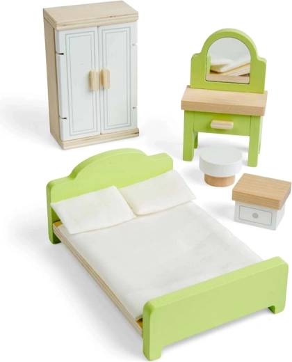 Giv børn realistisk leg i en lille verden. Det træ-soveværelse til dukkehus fra BIGJIGS TOYS er nænsomt udført i behagelige pastelfarver og naturtræ. Børn kan lægge dukker i seng, åbne skabet og arrangere møblerne præcis som de ønsker – alt med fokus på sikkerhed og holdbarhed.