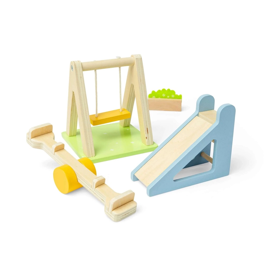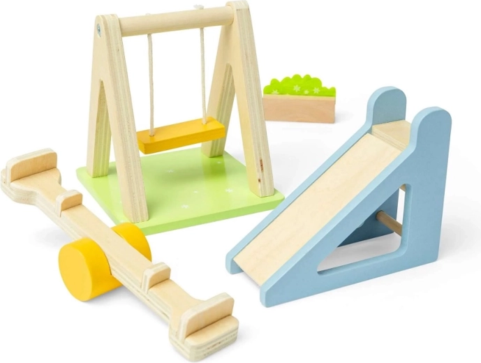 Forvandl haven i dit dukkehus til et sted fyldt med bevægelse og fantasi. Sættet indeholder de mest populære legepladselementer – gyngestativ, rutsjebane, vippe og et dekorativt blomsterbed. Takket være de glatte trædele i bløde pastelfarver er det behageligt og sikkert at håndtere.