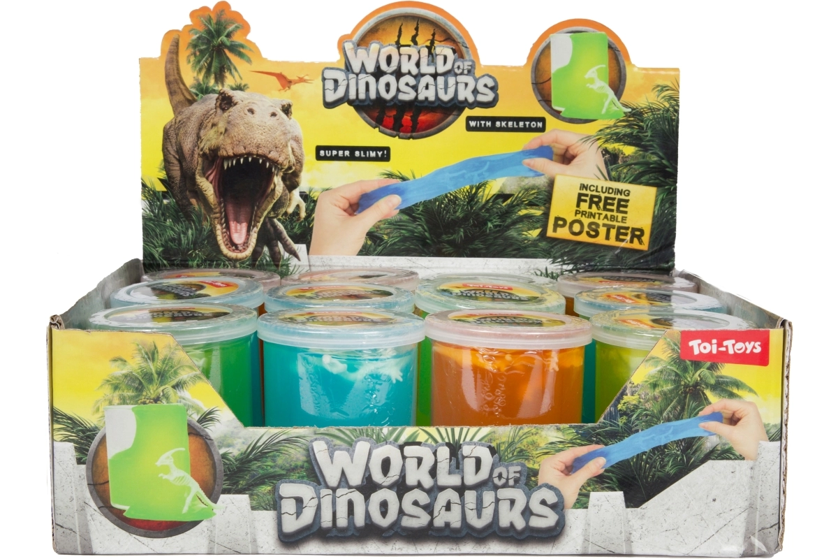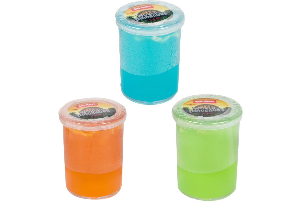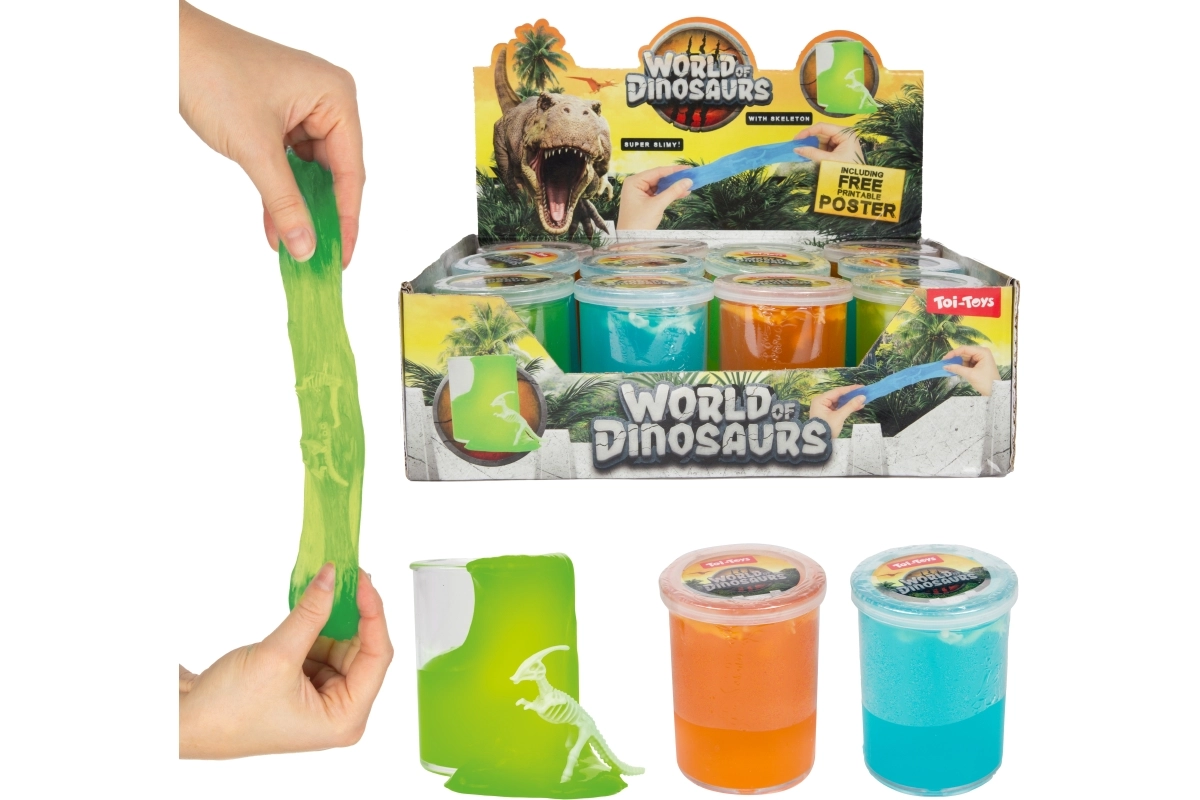 Oplev det sjove farverige slim med et skjult dinosaur-skelet, som begejstrer børn med sin elasticitet og overraskelsen indeni. Perfekt til sensorisk leg, finmotorik og stressaflastning. I en praktisk plastbøtte, flere farver afhængigt af lager, vægt 120 g, emballagemål 7,5 × 6 cm. Velegnet fra 3 år.