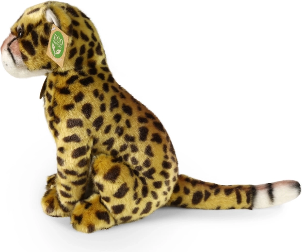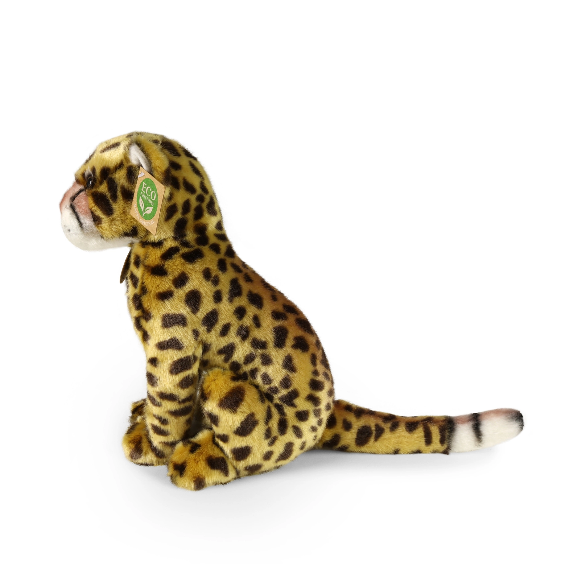 Den søde plysg gepard i højden 28 cm fra RAPPA’s eksklusive kollektion er lavet af ekstra blødt og silkeblødt materiale og fyldt med genanvendte fibre fra PET-flasker. Takket være håndværksmæssig forarbejdning virker den realistisk, er sikker selv for de allermindste børn og er perfekt til både kram og leg.