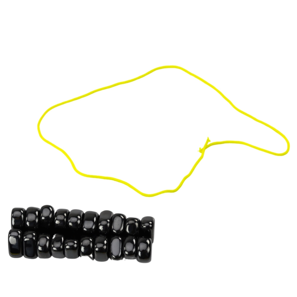 Blanke ovale sten ligger godt i hånden og glider let på underlaget. Den gule snor gør det muligt hurtigt at afmærke spillezonen hvor som helst.