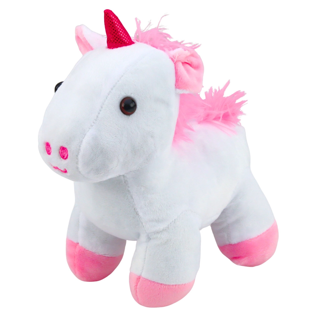 Det blide plysmateriale, behageligt at røre ved, giver børn komfort både under leg og hvile. Den hvide unicorn med rosa detaljer er en ideel sovekammerat.